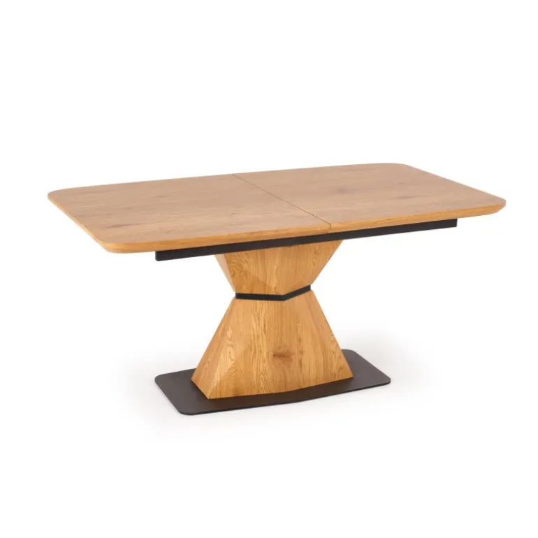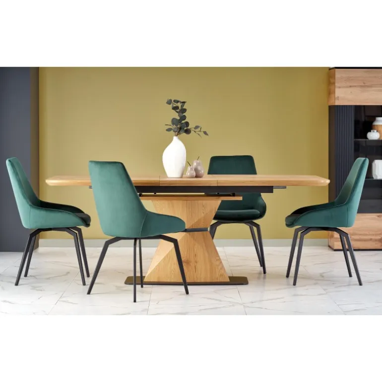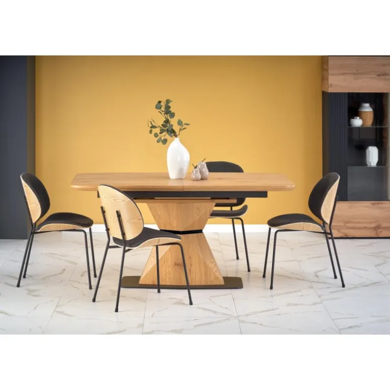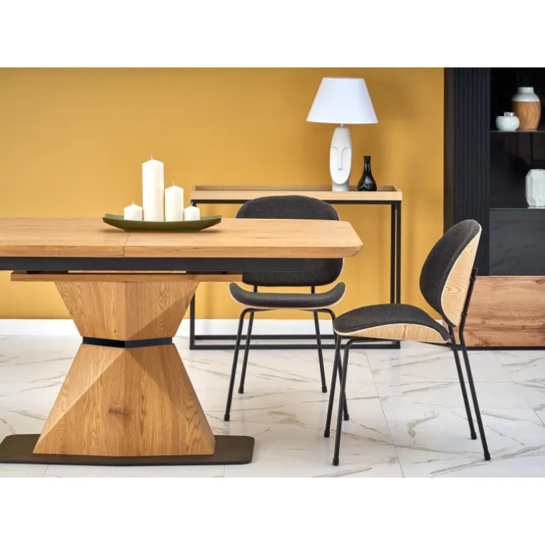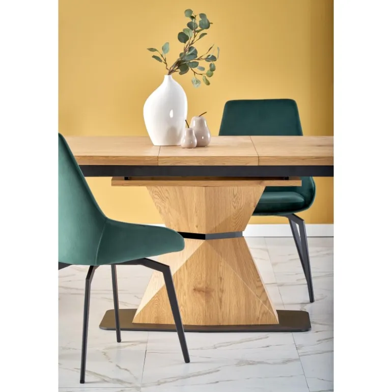 Oplev tidløs elegance med vores DIAMOND bord i gyldent egetræ. Dette smukke forlængelsesbord er designet til at imødekomme dine spisebehov og tilføje et strejf af luksus til dit hjem. Bordpladen er lavet af lamineret MDF og benene af pulverlakeret stål, hvilket sikrer både holdbarhed og stil. Med dimensioner på 160-200/89/76 cm er det perfekt til både små og store sammenkomster. Den gyldne egetræsfarve på både top og ben giver en sammenhængende og sofistikeret æstetik.