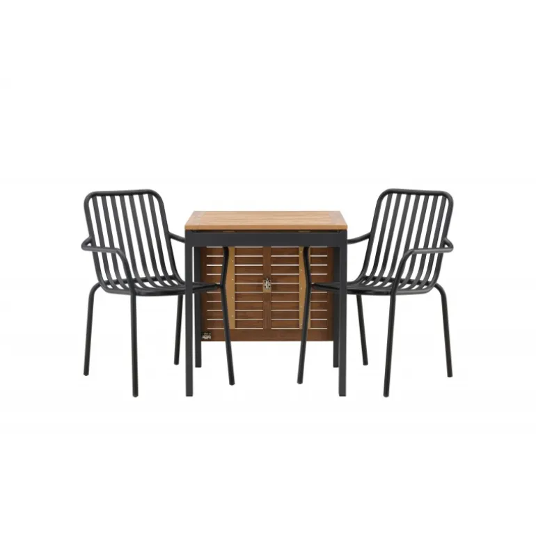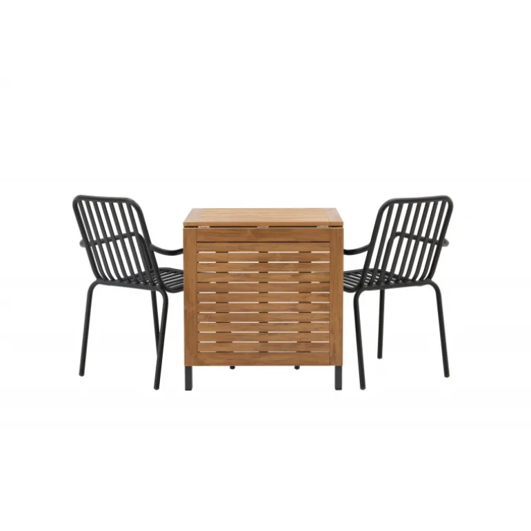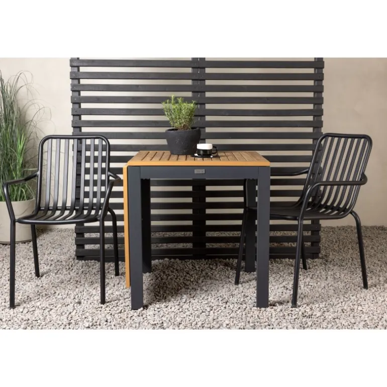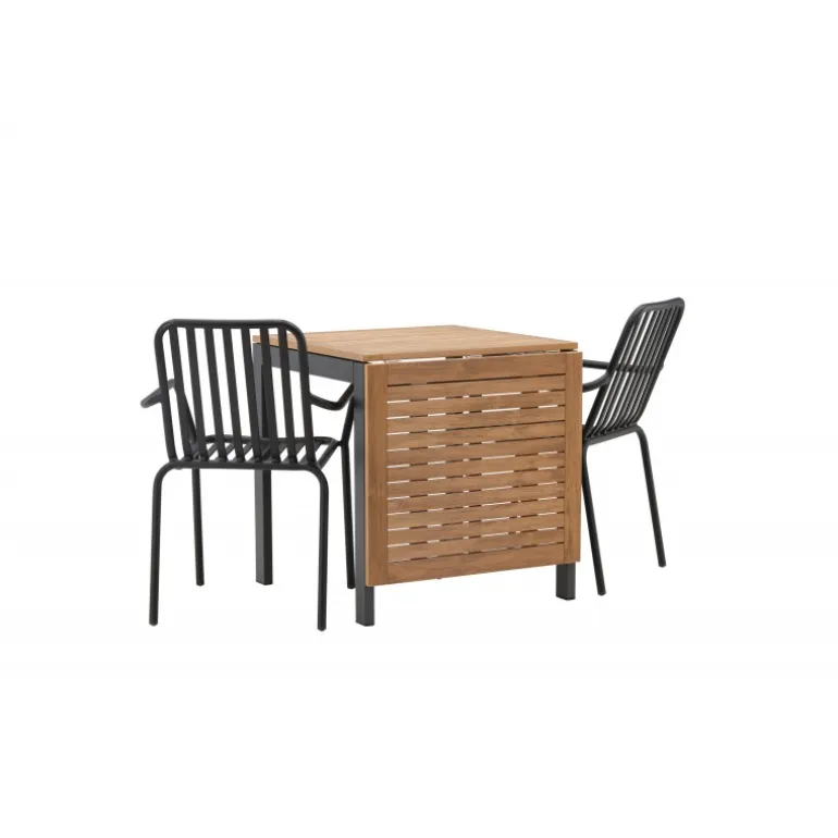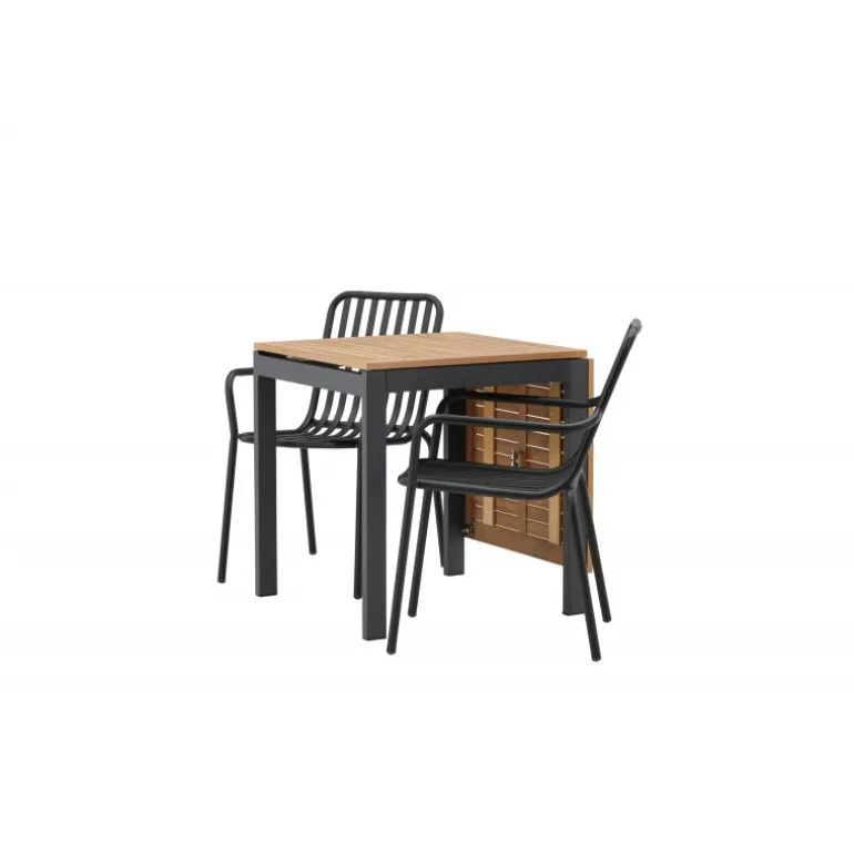 Charmerende, praktisk og nemt at tilpasse cafégruppe med alle de rette funktioner! Diego cafébordet er lige så smart som det er stilfuldt med en bordplade i brun aintwood og ben i sort aluminium. Bordet har også en simpel konstruktion, der gør det nemt at folde ud eller ind udvidelsespladerne langs siderne. Her i perfekt match med 2 sorte spisestole fra serien Beijing. Stolen er i sort aluminium, har et ribbet design og integrerede armlæn for ekstra komfort! Her kan du nyde din kaffepause mest muligt! Bordmål: 130/70x70cm.