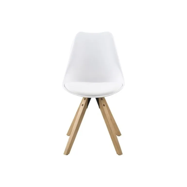 Moderne spisebordsstol i retrolook med hvid plastsæde polstret med skum og hvid tekstillæderbetræk. Stolen hviler på fire oliebehandlede træben, som sikrer en større grad af smudsresistens.