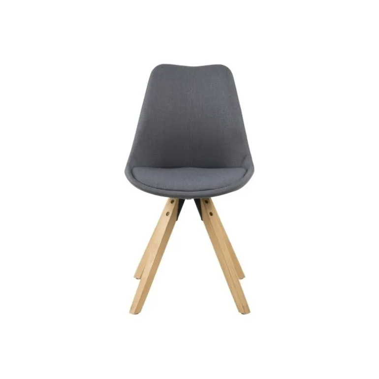 Moderne spisebordsstol med formstøbt polstret sæde og koksgråt tekstillæderbetræk. Stolen hviler stabilt på fire lyse træben, der er behandlet med hvidpigmenteret olie, hvilket giver træet en lækker finish og sikrer en større grad af smudsresistens. Et smart retroinspireret design til det moderne hjem.