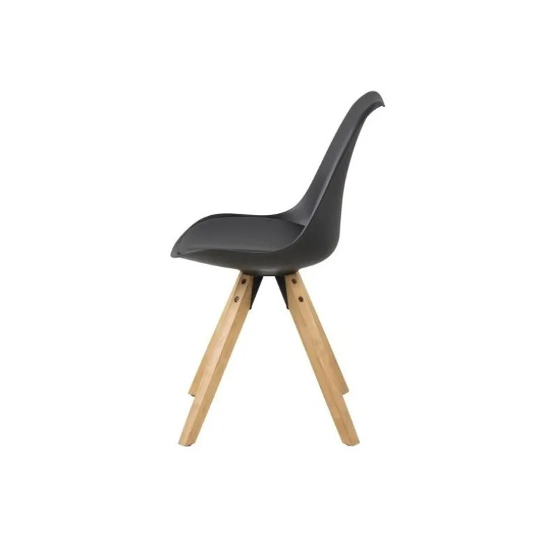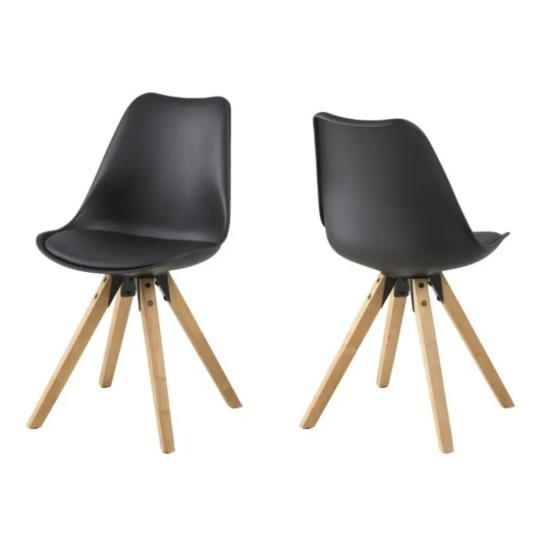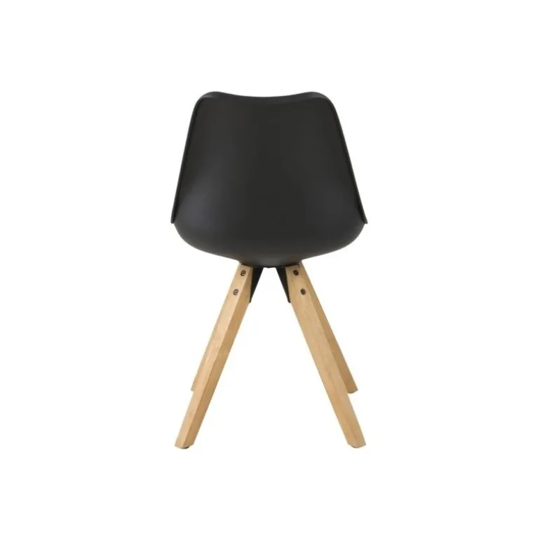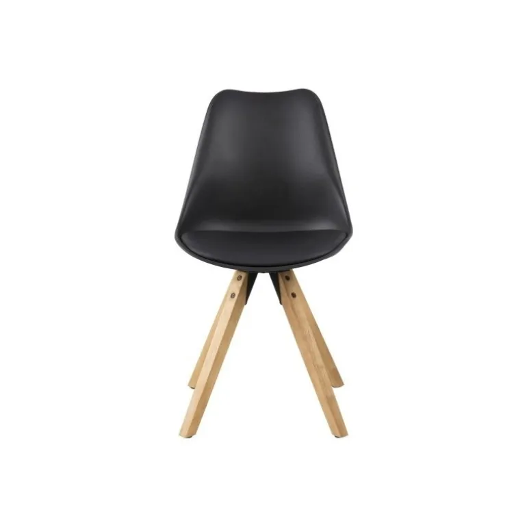 Moderne spisebordsstol i retrolook med sort plastsæde polstret med skum og sort tekstillæderbetræk. Stolen hviler på fire oliebehandlede træben, som sikrer en større grad af smudsresistens.