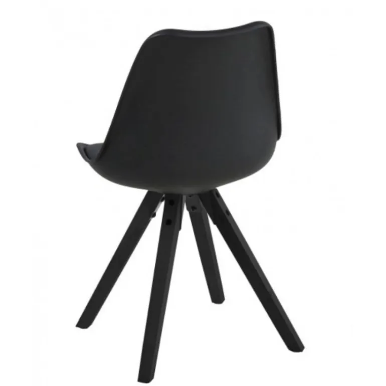 Moderne spisebordsstol i retrolook med sort plastsæde polstret med skum og sort tekstillæderbetræk. Stolen hviler på fire sortmalede ben i gummitræ.