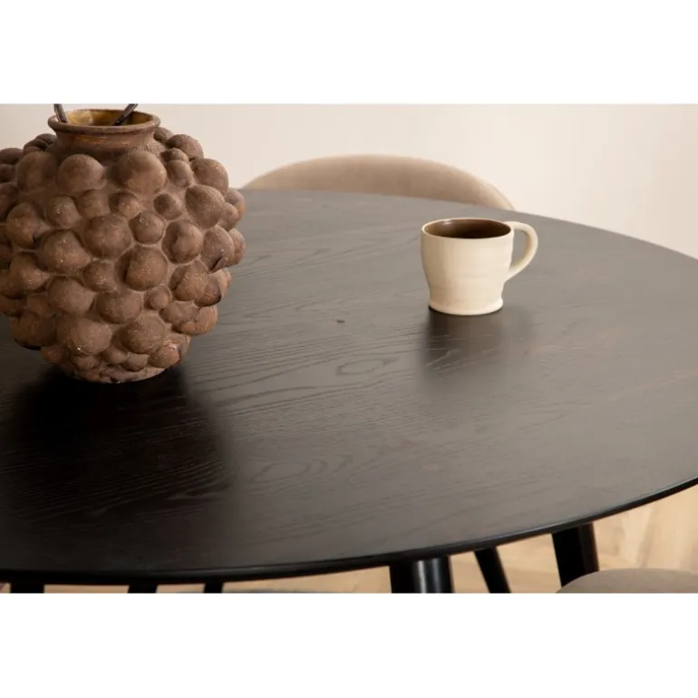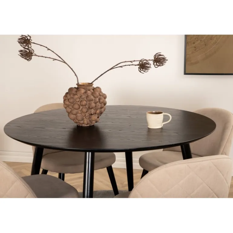 Skab et charmerende midtpunkt for dig og din familie! Vores runde spisebord i Dip-serien har en stilfuld bordplade i MDF og let udadbuede metalbordben. Bordet er konsekvent i sort farve, hvilket giver rummet et moderne og luksuriøst udtryk. Her sammen med måtter fra serien Velvet Stitches i beige polyester. Stolebenene er let udadbuede i sort jern og matcher bordet perfekt. Nyd behagelige måltider fremover!