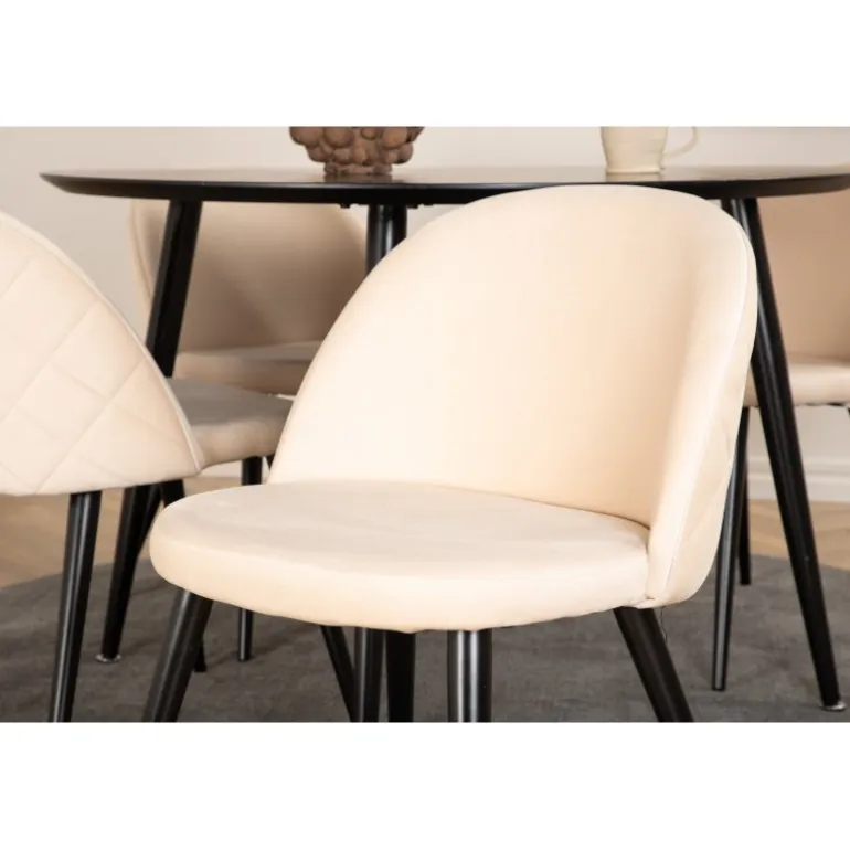 Skab en indbydende blikfang i hjemmets hjerte! Vores runde spisebord i Dipp-serien har en stilfuld bordplade i MDF og let udadvendte metalbordben. Bordet er konsekvent i sort farve, hvilket giver en moderne og luksuriøs følelse til rummet. Her sammen med 4 af vores populære spisebordsstole Velvet Stitches, der bidrager til en flot helhed i stuen. Stolebenene er let udadvendte i sort jern, og fløjlsæderne i beige giver en dejlig glans til rummet. Nyd behagelige måltider!