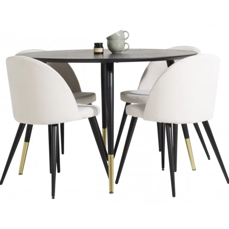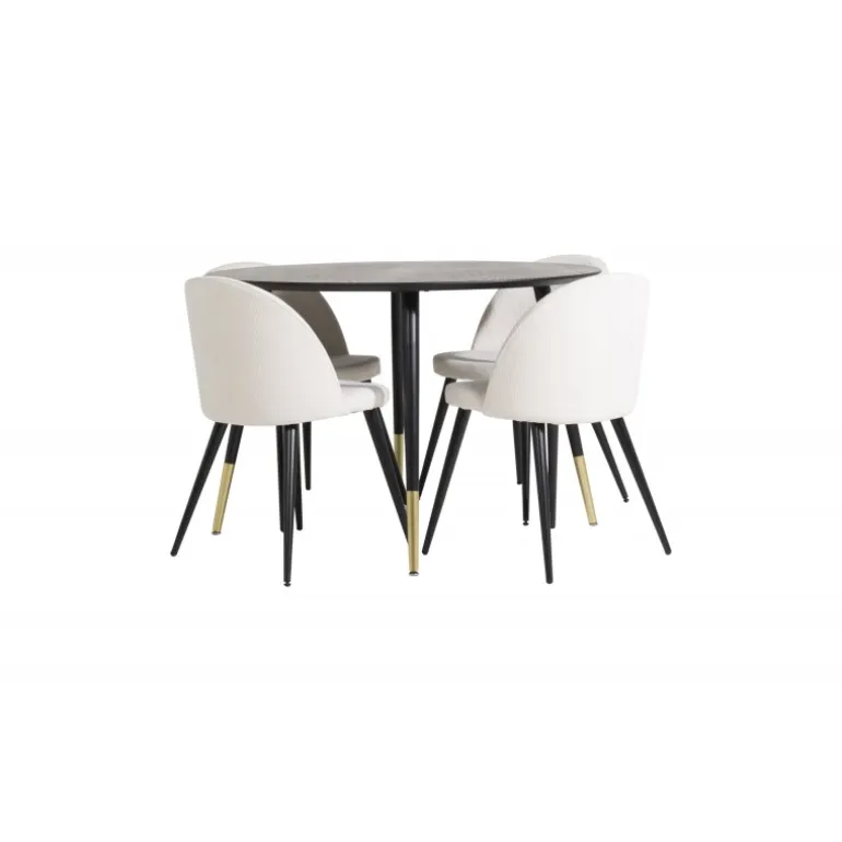 - Flerfarvet valg: Bord i sort og guldfarver, stole i sort og hvid for at matche din indretning.