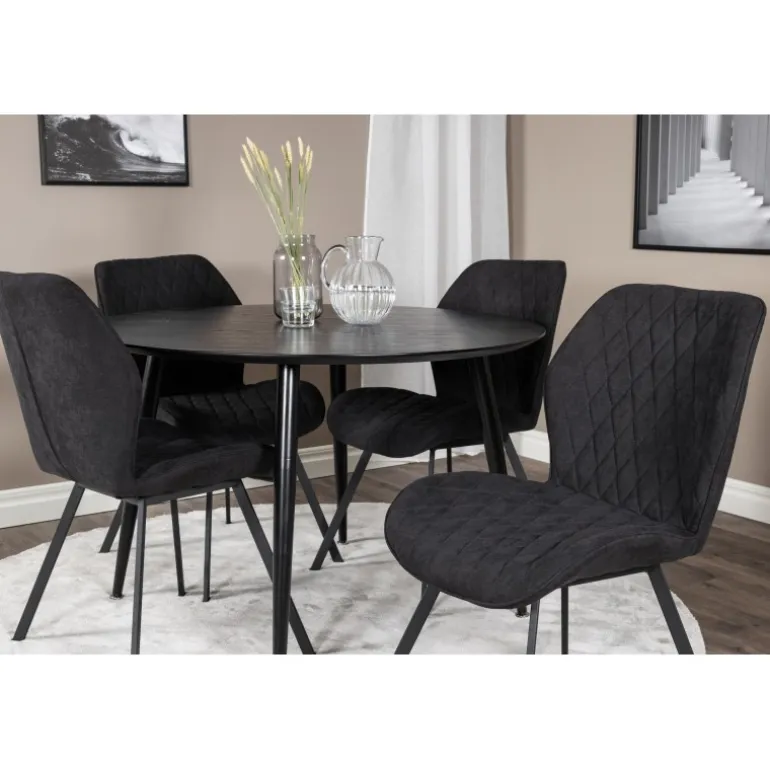 - Moderne Design: Stilfuldt rundt spisebordssæt med sorte stole i fløjl.