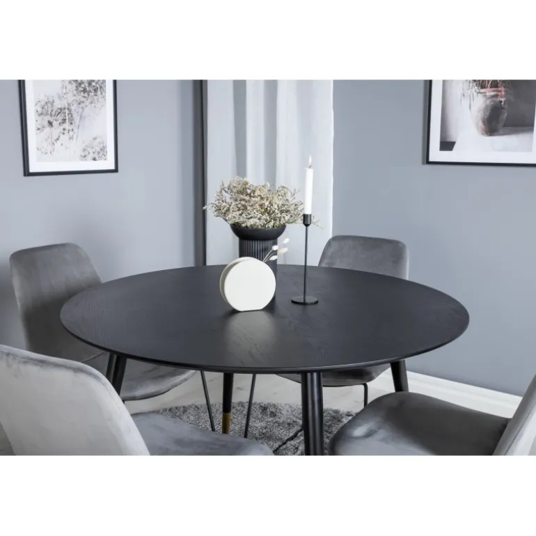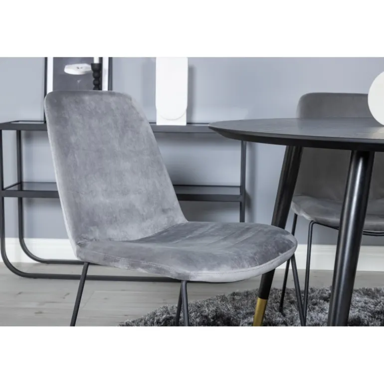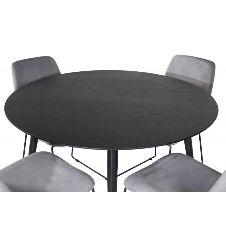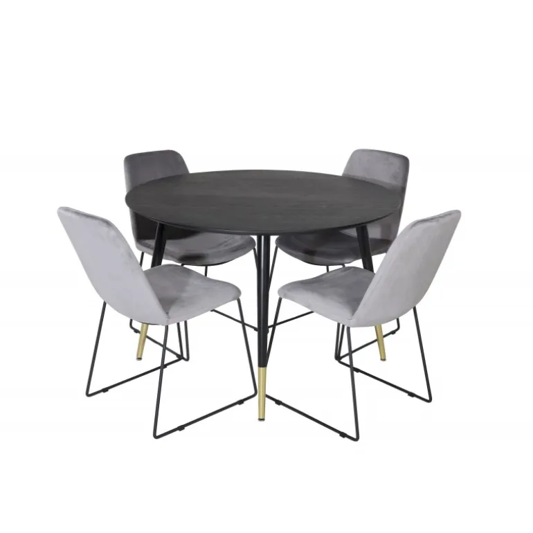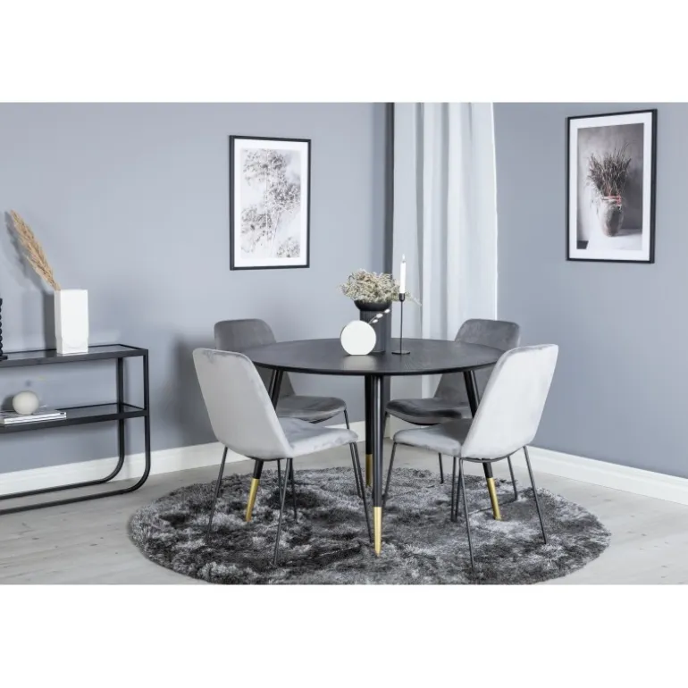 Oplev det klassiske Dipp Rundt Spisebordssæt, der passer perfekt ind i de fleste hjem! Dette Spisebordssæt kombinerer en elegant rund spisebord med komfortable stole fra Muce-serien. Perfekt til dem, der ønsker at skabe en hyggelig og moderne atmosfære i hjemmet. Bordet og stolene er fremstillet af kvalitetsmaterialer som bøjetræ, skum, MDF og stål, hvilket sikrer holdbarhed og stil. Tilgængelig i farverne sort, guld og grå for at matche enhver indretning.