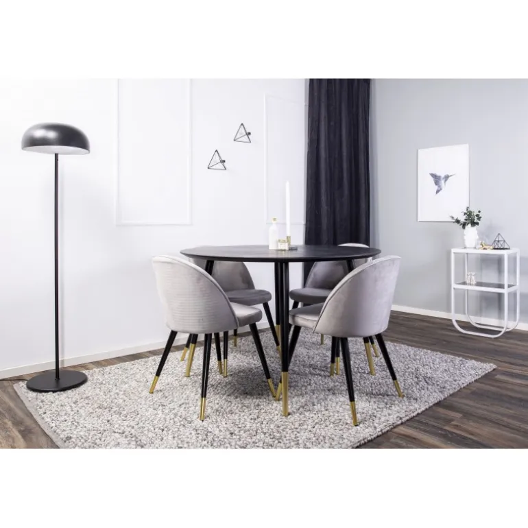 Oplev luksus og elegance med Dipp Rund Spisebordssæt, som består af et rundt spisebord og matchende stole med guld-detaljer på benene. Spisebordet i sort kombineret med de grå Velvet stole skaber en sofistikeret og stilfuld atmosfære i dit hjem. Dette sæt er perfekt til dem, der ønsker at tilføje et strejf af glamour til deres spisestue.
