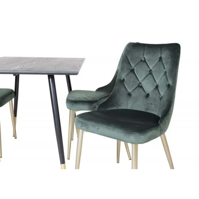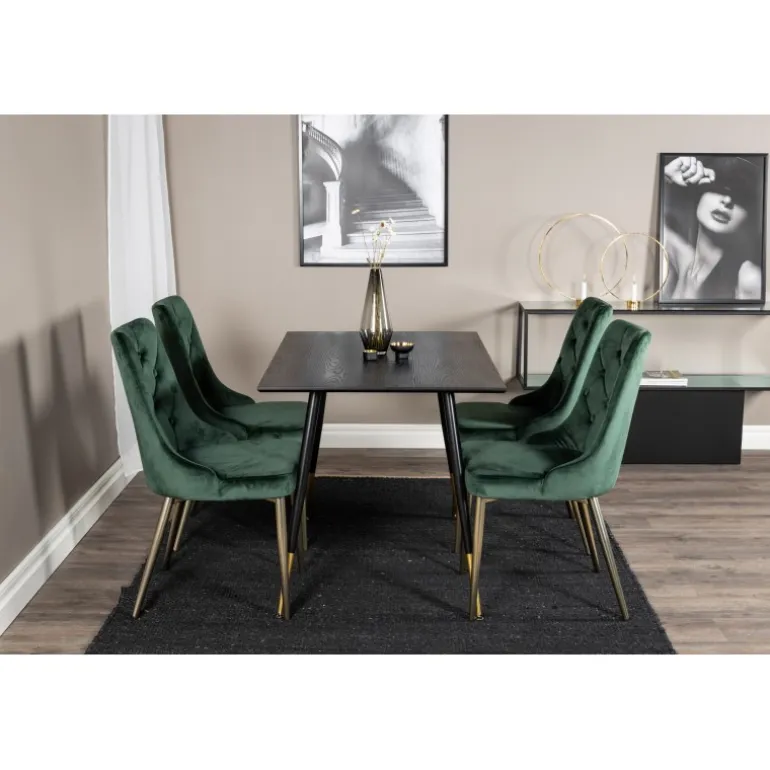 Dipp Rundt Spisebordssæt kombinerer forskellige farver og materialer for at skabe en moderne, hyggelig og tidløs spiseoplevelse. Med vores spisebord i MDF og stål samt vores velour spisestole, får du en stilfuld og funktionel løsning til dit hjem. Sort, guld og grøn farver giver et elegant touch, mens materialevalget sikrer holdbarhed og stabilitet. Perfekt til både hverdagsbrug og særlige lejligheder.