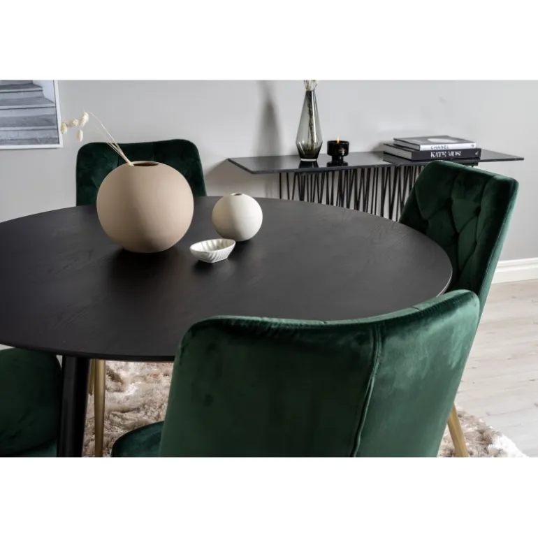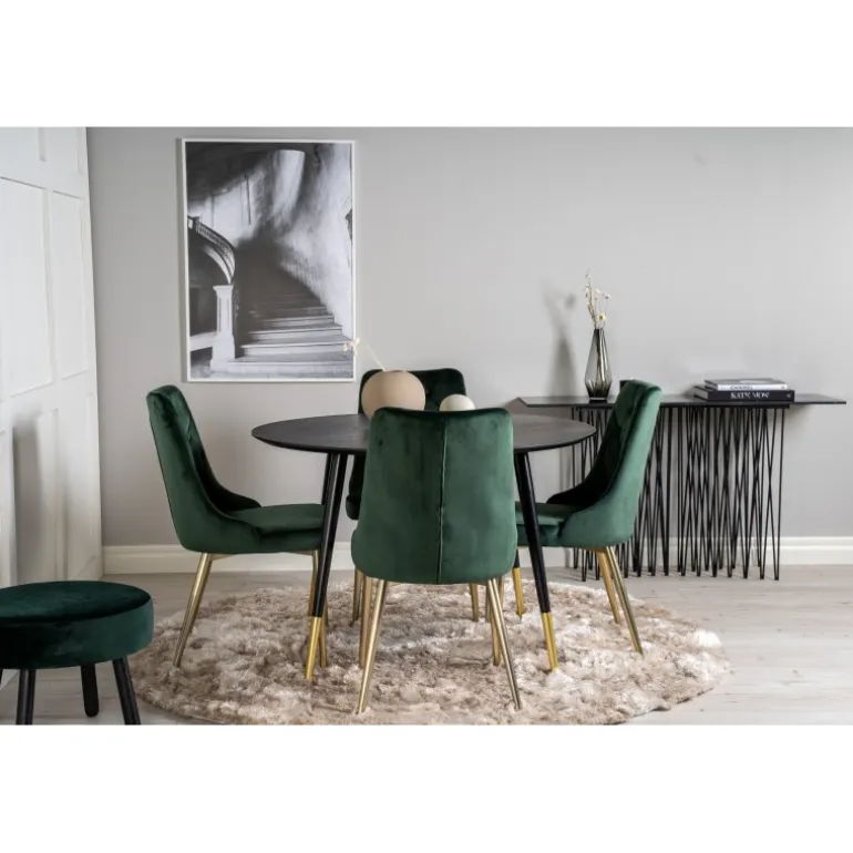 Det stilfulde Dipp Rundt Spisebordssæt kombinerer den elegante spisebord fra Dipp-serien med de komfortable og stilfulde spisebordsstole fra Velvet-serien. Kombinationen skaber en hyggelig og moderne følelse i hjemmet. Bordpladen i MDF med sort finish matcher perfekt med de grønne og guldfarvede stole, hvilket giver et luksuriøst touch til din spisestue. Dette sæt er ideelt til dem, der ønsker både komfort og stil i deres hjem.