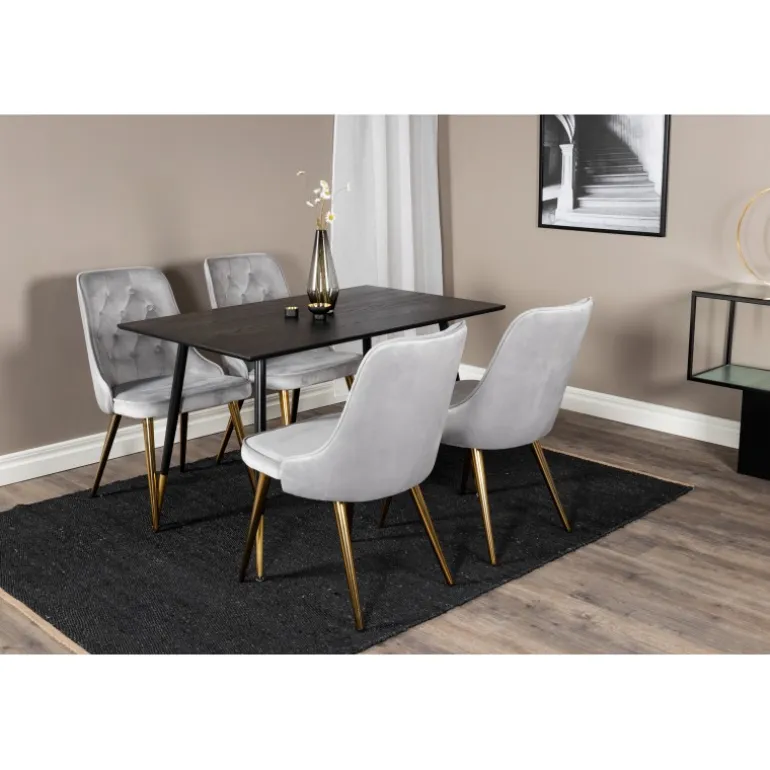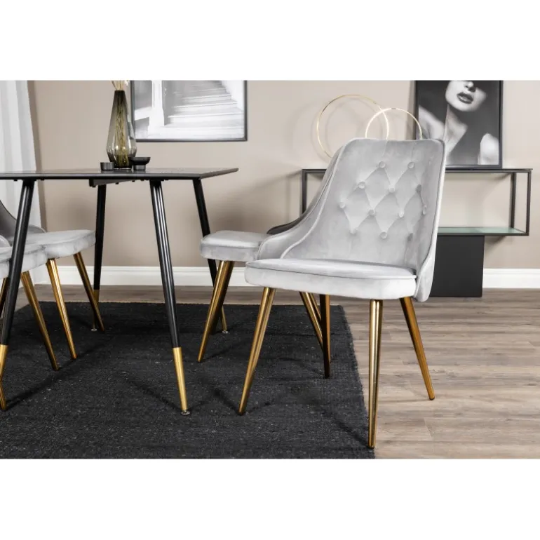 Et elegant Spisebordssæt, der indgyder en luksuriøs og moderne følelse! Trendy gulddetaljer møder blød velour i denne perfekte kombination – spisebordet Dipp sammen med grå velourstole i serien Velvet. Lad dig og din indretning inspirere af denne trendsikre Spisebordssæt, der er fantastisk til både hverdag og fest.