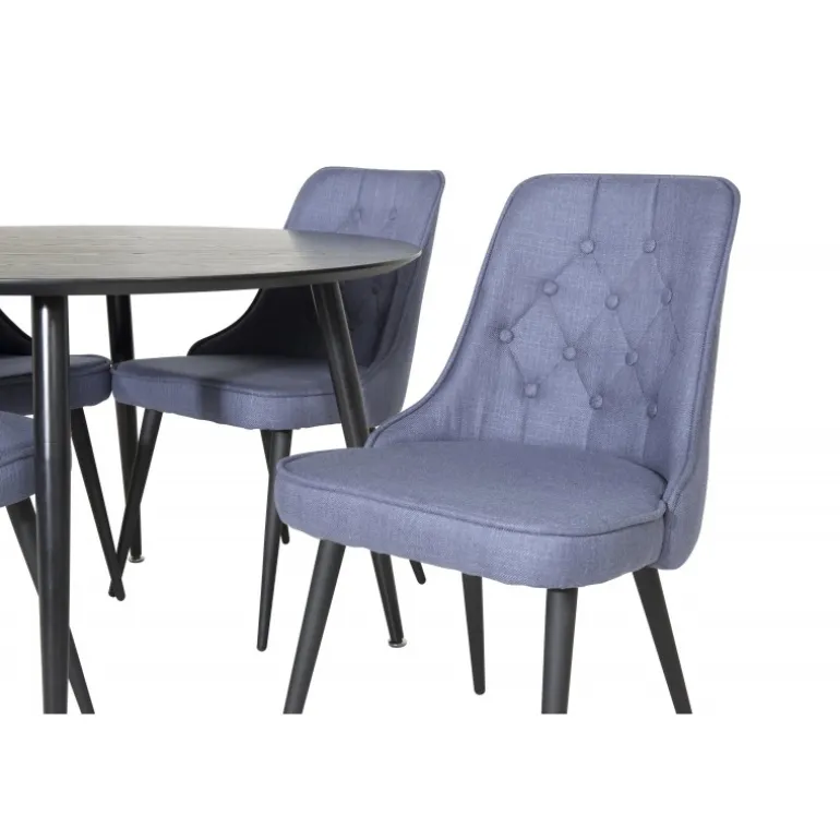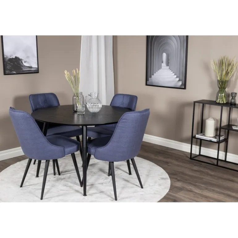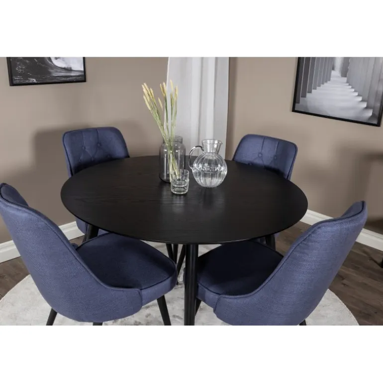 - Elegant Udseende: Sort bordplade med matchende stole i sort og blå.