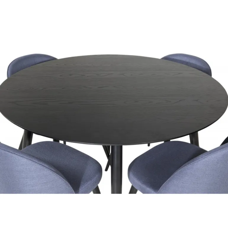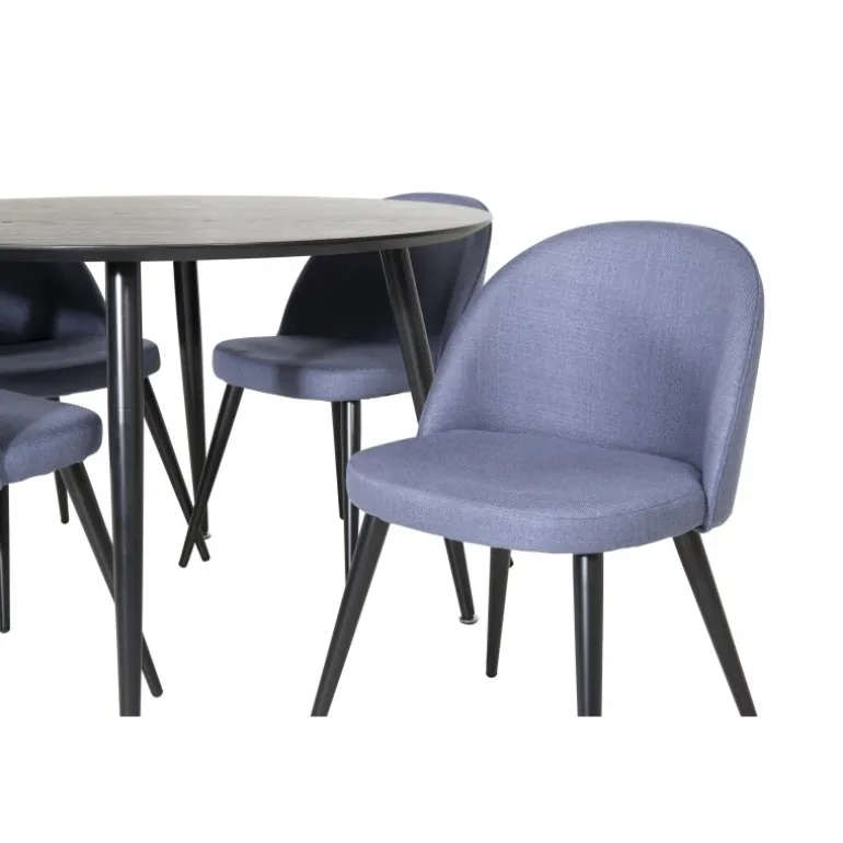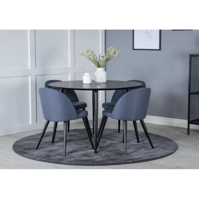 Opgrader din spisestue med Dipp Rundt Spisebordssæt. Dette moderne og stilfulde Spisebordssæt inkluderer et rundt spisebord og Velvet spisestole, der tilsammen skaber den perfekte kombination til hjemmets hjerte. Med sit sofistikerede design og høj kvalitet passer sættet perfekt til dine behov og komplementerer din øvrige indretning. Spisebordet og stolene er lavet af holdbare materialer som bøjetræ, MDF og stål, hvilket sikrer langvarig brug og stabilitet. Fås i sort og blå farver.