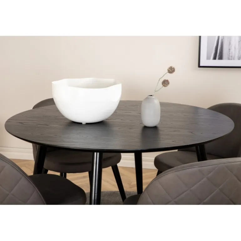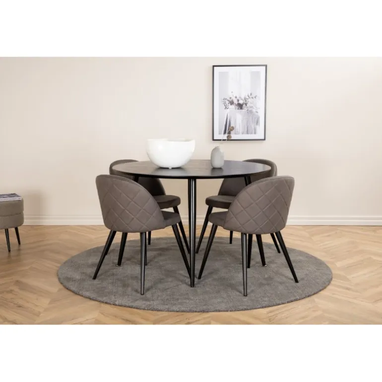 Skab et charmerende midtpunkt for dig og din familie! Vores runde spisebord i Dip-serien har en stilfuld bordplade i MDF og let udstillede metalbordben. Bordet er i en konsekvent sort farve, der giver rummet et moderne og luksuriøst udseende. Her sammen med måtter fra serien Velvet Stitches i grå mikrofiber. Stolebenene er let udstillede i sort jern og matcher bordet perfekt. Nyd behagelige måltider fremover!