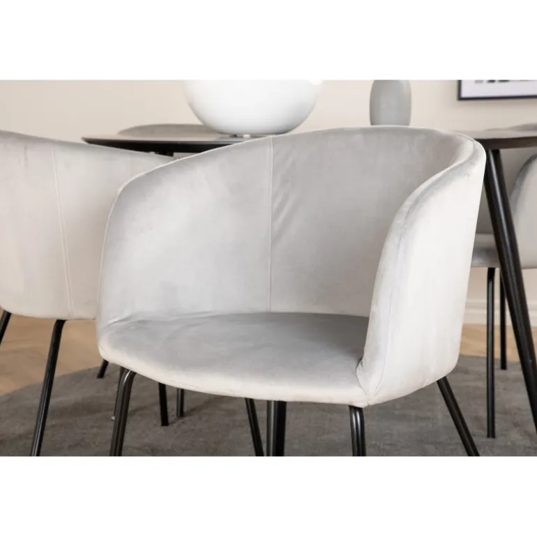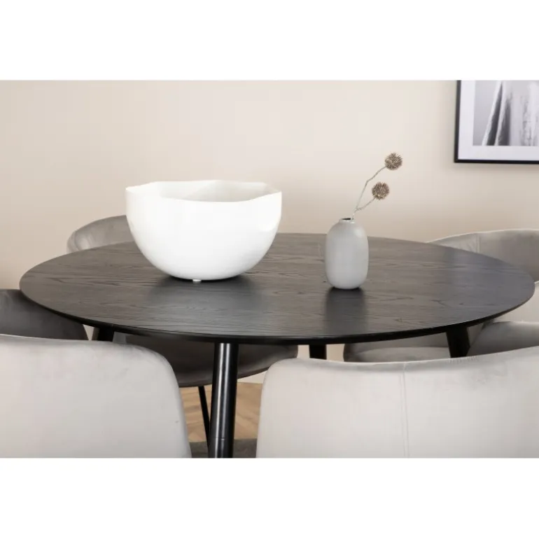 Skab et charmerende midtpunkt for dig og din familie at samles omkring! Vores runde spisebord i Dipp-serien har en stilfuld bordplade i MDF og let udadbuede metalbordben. Bordet er gennemgående i sort farve, hvilket giver en moderne og luksuriøs følelse til rummet. Her i perfekt kombination med 4 Berit spisebordsstole i luksuriøst design. Sædet er pompøst i grå velour og stolens ben er stilfuldt smalle i sort jern. Sid behageligt og nyd hyggelige måltider.