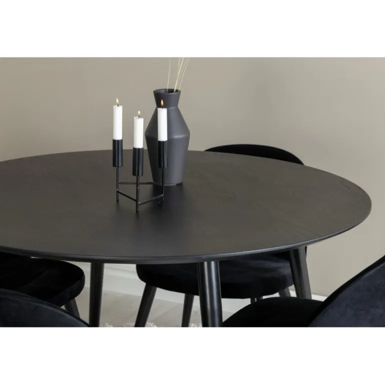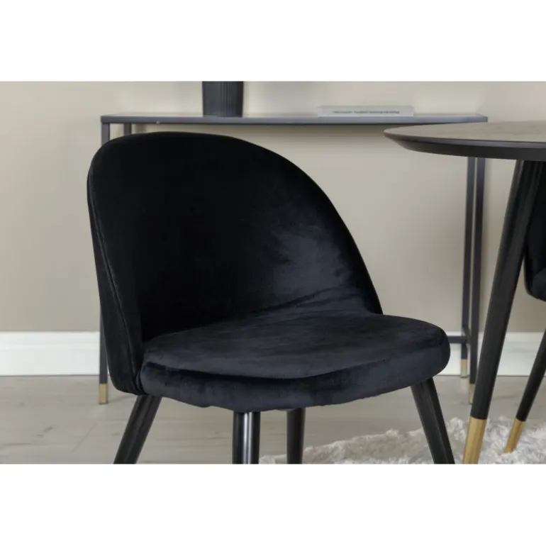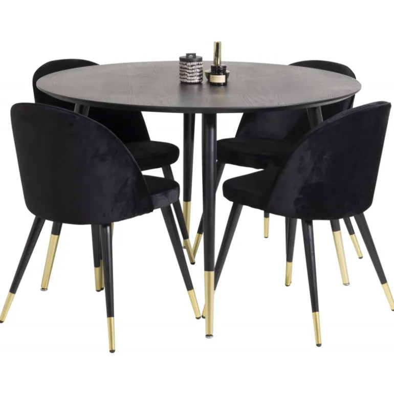 Oplev en madgruppe i moderne og stilfuldt design med Dipp Rundt Spisebordssæt. Dette sæt kombinerer den elegante Dipp-spisebord med de luksuriøse Velvet spisebordsstole, hvilket skaber en perfekt harmoni i dit hjem. Dipp Rundt Spisebordssæt passer ideelt til dine behov og matcher smukt med din øvrige indretning. Med sin sorte og gyldne farvekombination og materialer som MDF, stål, og velvet, bringer dette sæt både funktionalitet og æstetik til dit spisested.
