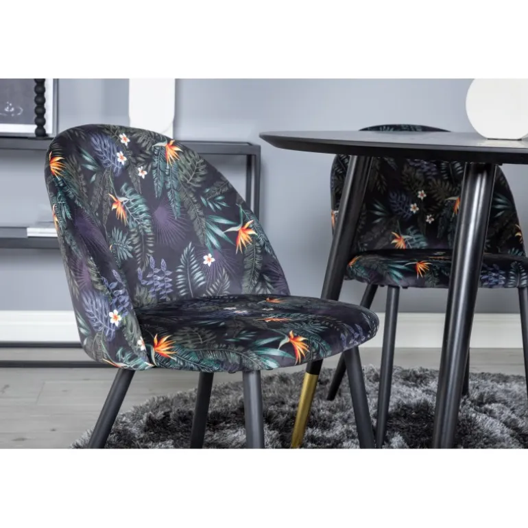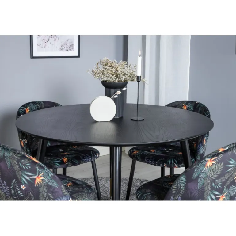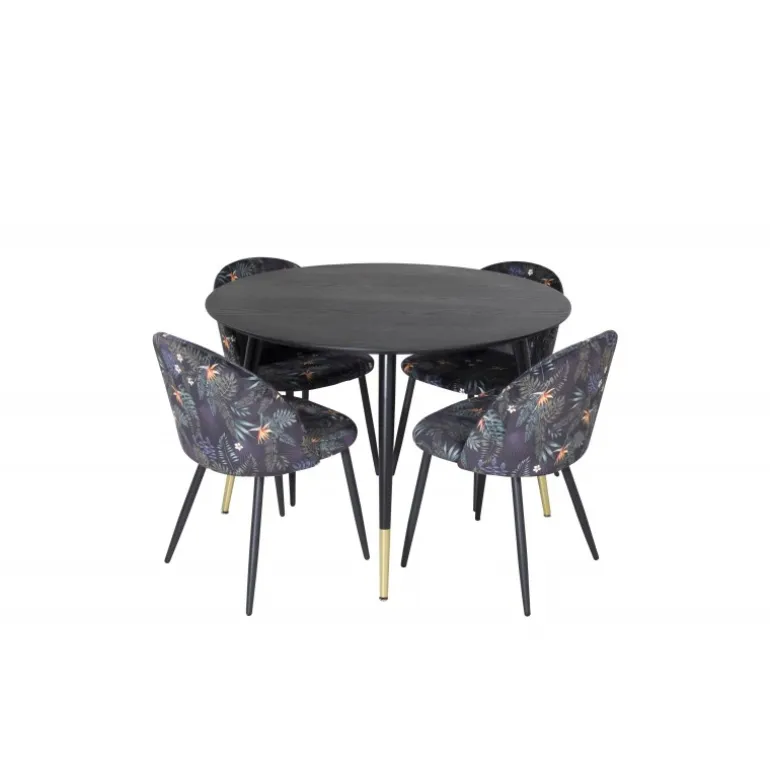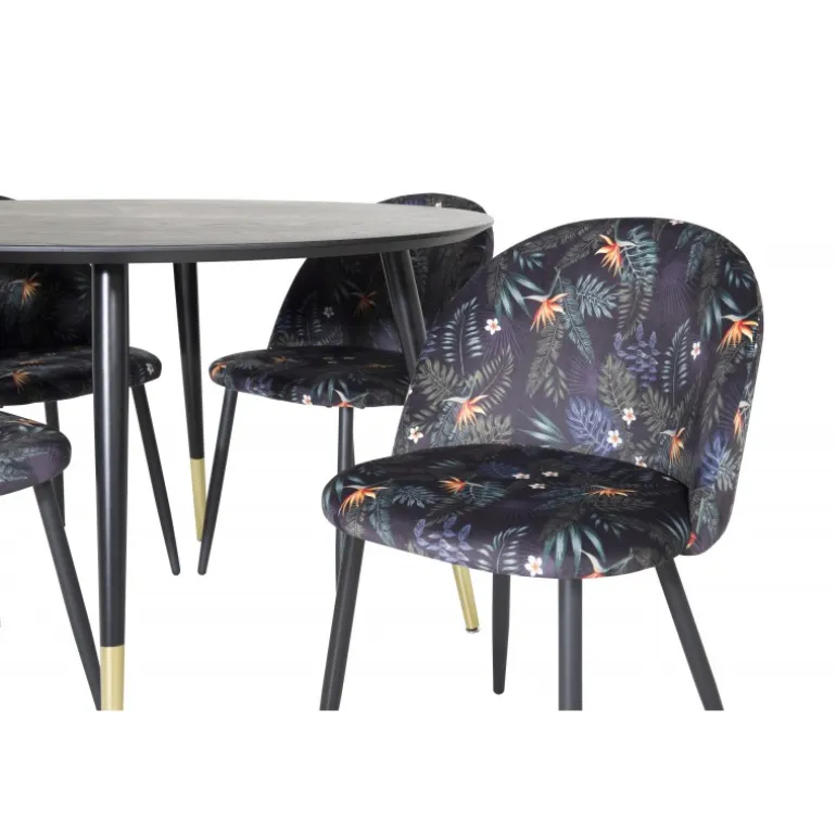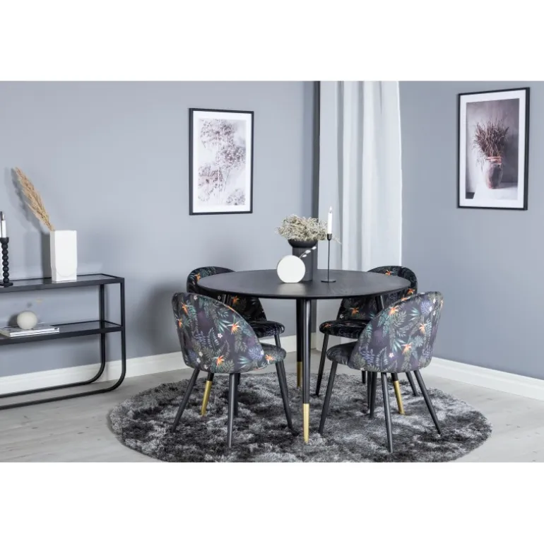 Dip, moderne og stilrent spisebord – her sammen med spisebordsstole fra serien Velvet. Skab noget pænt og socialt med plads til god mad og hygge! Dette Spisebordssæt er perfekt til at skabe en moderne stemning i dit hjem. Med det elegante sorte bordplade og guldfarvede detaljer vil dette sæt helt sikkert imponere dine gæster. Stolene er komfortable og stilfulde, hvilket gør dem ideelle til lange middage og samtaler.