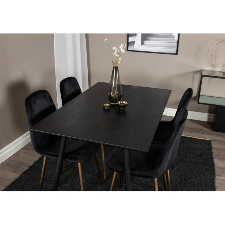 Sort + guld = elegance! Sort madbord med gulddetaljer i serien Dipp sammen med pompøse sorte velourstole i serien Polar er garanteret et blikfang i rummet. Perfekt til at tilføje et strejf af luksus til din spiseplads. Dette sæt kombinerer stil og funktionalitet, hvilket gør det til et ideelt valg for dem, der ønsker at imponere gæsterne. Med materialer af høj kvalitet som MDF, krydsfiner og stål, er det både robust og holdbart. Samlingen kræves, men resultatet er værd at indsatsen.