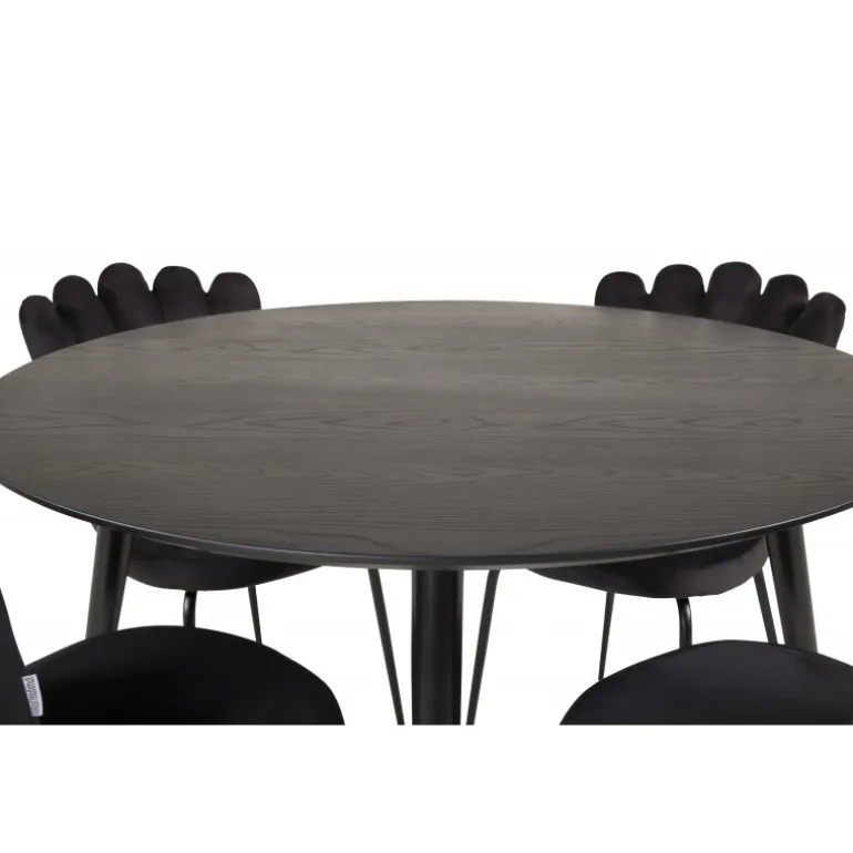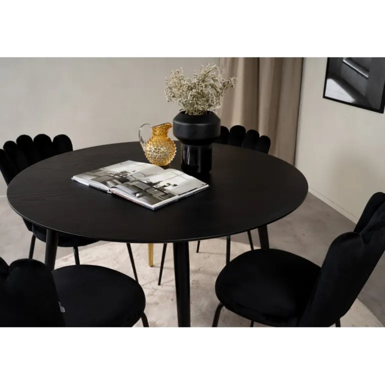 Oplev elegance og stil med Dipp Rundt Spisebordssæt. Dette sæt indeholder et sort spisebord med flotte guldfarvede benafslutninger og sorte spisebordsstole fra Limhamn-serien. Stolene har unikke ryglæn, der giver sættet et moderne og unikt udtryk. Perfekt til at skabe en sofistikeret atmosfære i dit hjem.