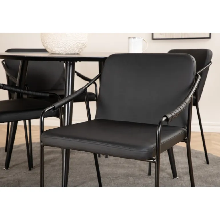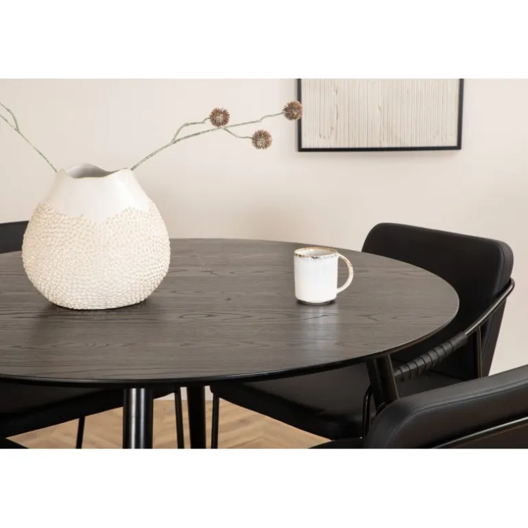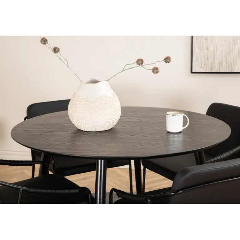 Et rundt spisebord er fantastisk til at skabe en indbydende atmosfære – her ender ingen på kanten! Dipp spisebord har et modebevidst design med en bordplade lavet i MDF. De let udadvendte bordben er lavet af metal. Sammen med 4 spisebordsstole fra serien Dispute. Stolene har sæde og ryg i sort polyurethan-membran og polyester samt jernben. Indret dit hjem stilfuldt og indbydende!
