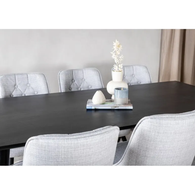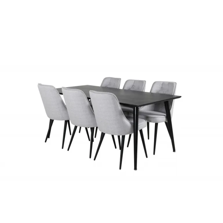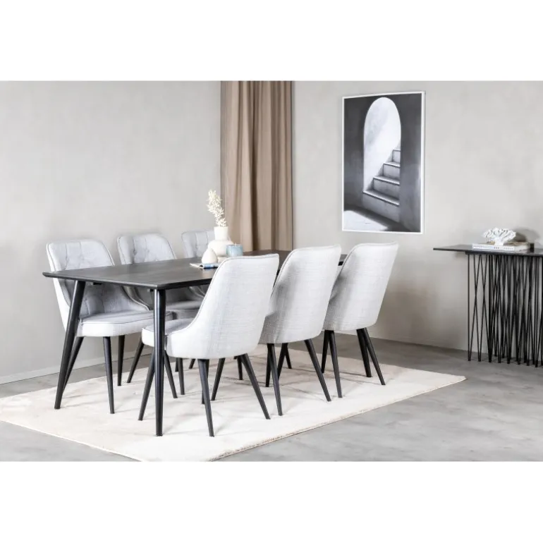 Lad dette smukt matchede spisestuesæt med en moderne følelse blive et naturligt samlingspunkt i dit hjem. Spisestolene i fløjl tilbyder god komfort, og spisebordet Dipp sikrer, at der er plads til alle. Med en elegant sort bordplade og stole i lysegrå fløjl, tilføjer dette sæt både stil og funktionalitet til din spisestue.