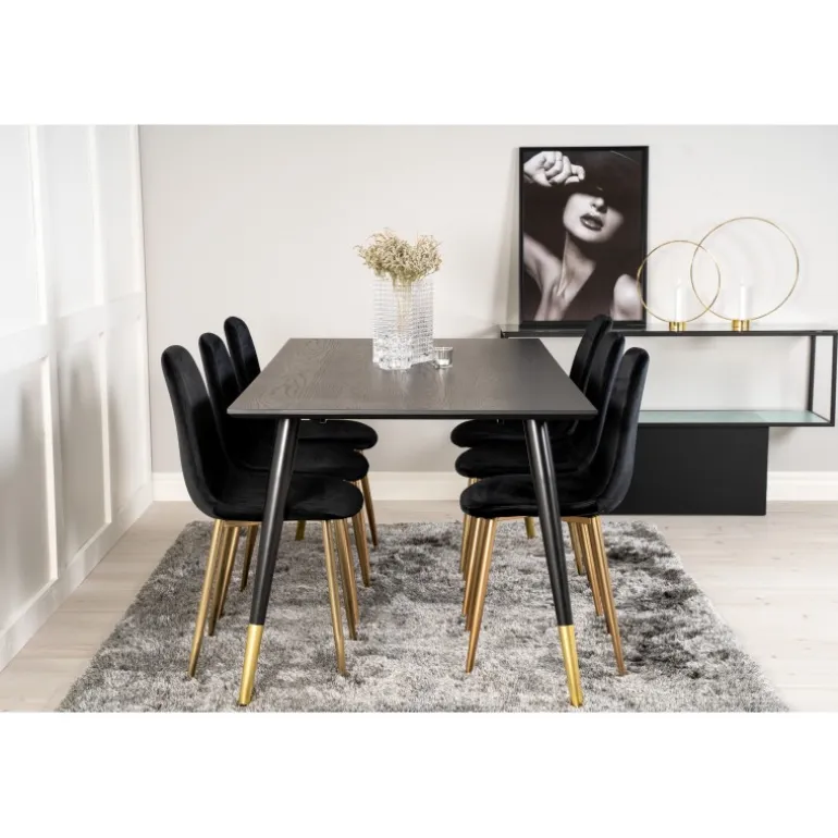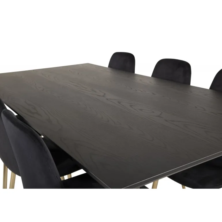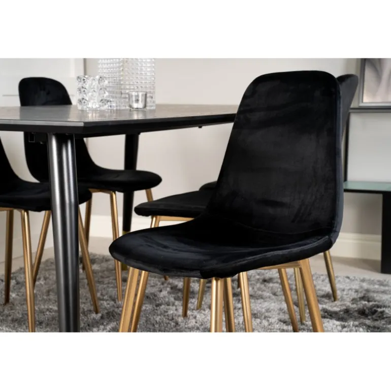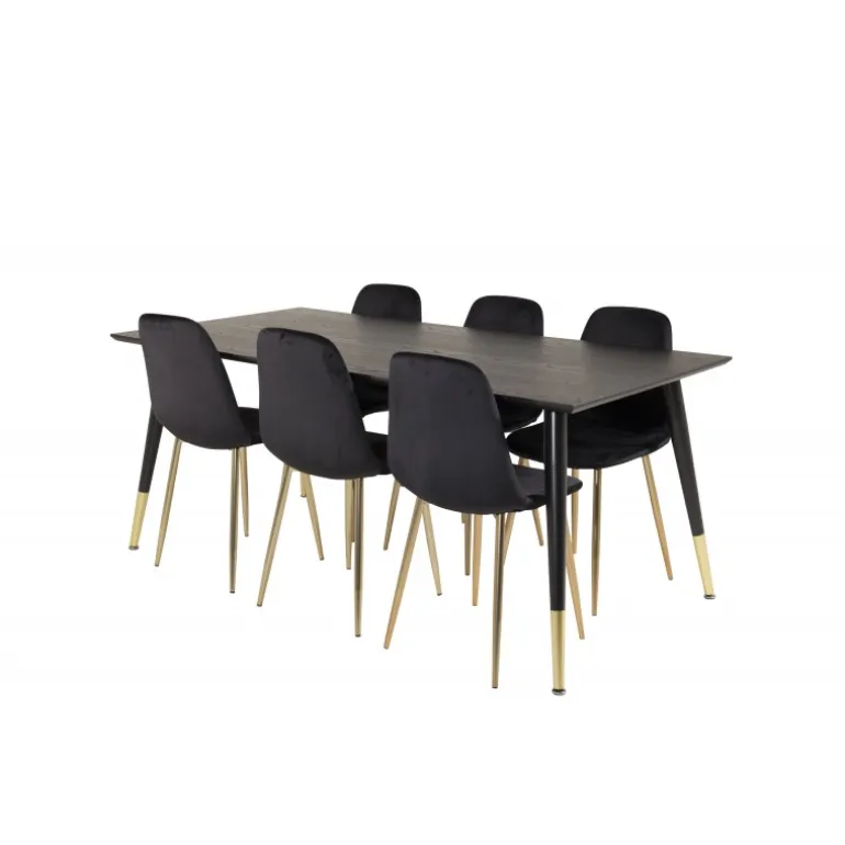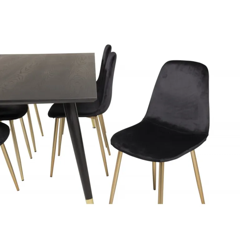 Det stilfulde Dipp Rektangulære Spisestuesæt kombinerer elegance og komfort. Med detaljer i messing på bordets ben, som smukt matcher stolens ben, bringer dette spisestuesæt luksus direkte ind i dit hjem. Bordet og stolene er en del af den eksklusive Polar-serie, hvilket sikrer høj kvalitet og en sofistikeret æstetik.