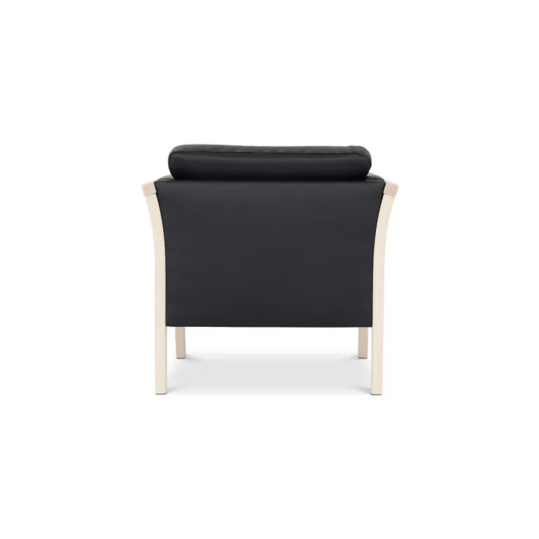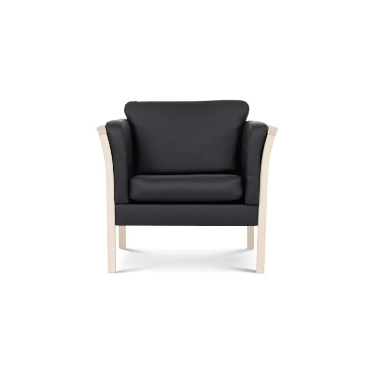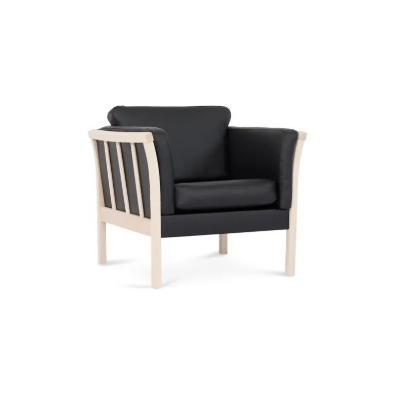 Dragør lænestol i tidløst kvalitetsdesign, monteret med kraftigt sort læderbetræk og stilrene ubehandlede bøgetræs gavle. En ægte klassiker, som udmærker sig med god komfort og enkle, indbydende former.