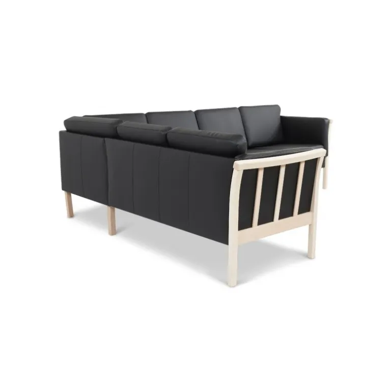 Dragør vendbar hjørnesofa i tidløst kvalitetsdesign, udført med kraftigt sort læder betræk og stilrene ubehandlede tremmegavle i massivt bøgetræ. En klassisk sofa, som udmærker sig med yderst behagelig siddekomfort og enkle, indbydende former. Sofaen kan nemt spejlvendes ved montering.