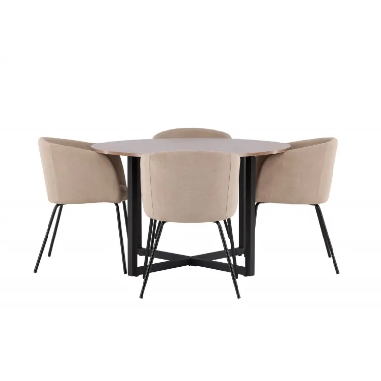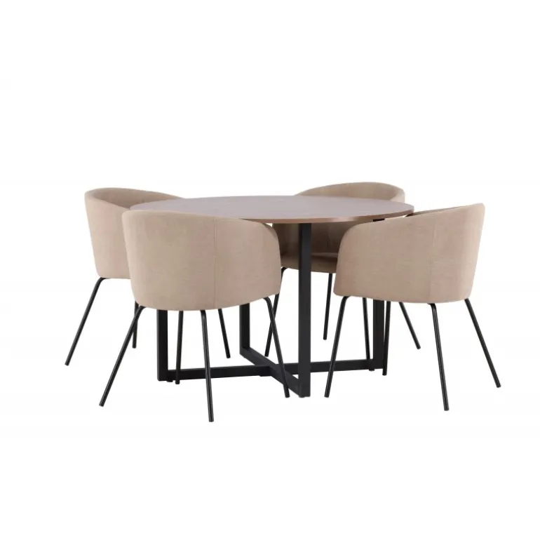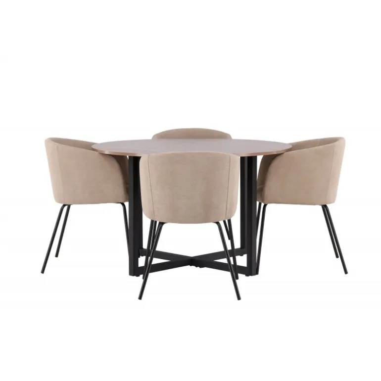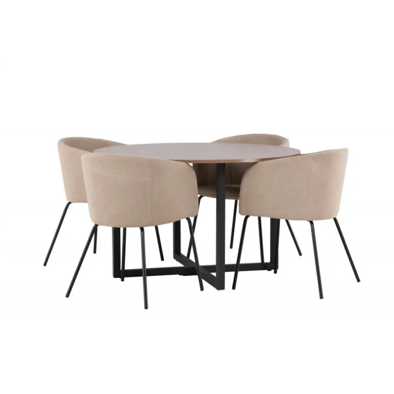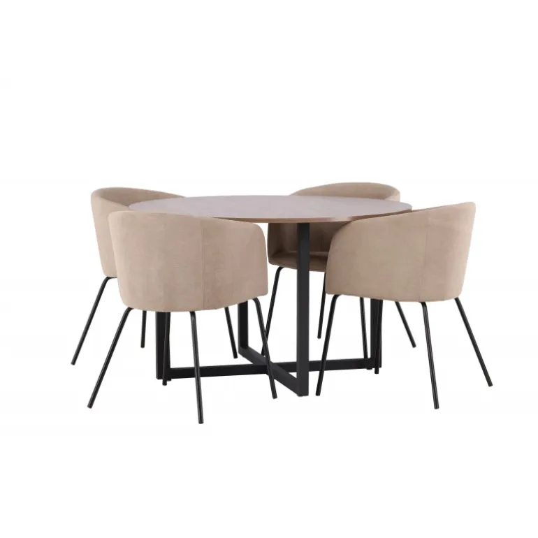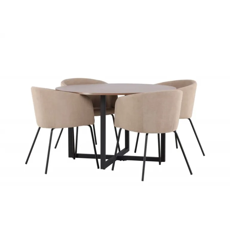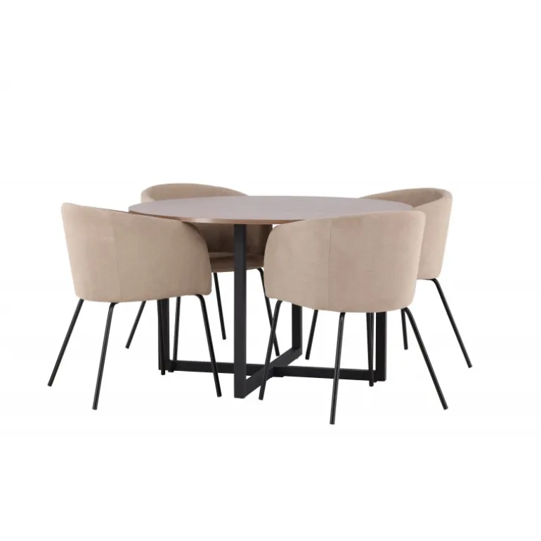 Oplev en Spisebordssæt, der udstråler charme og elegance! Vores runde spisebord Durango har en valnøddefarvet bordplade i MDF og lige bordben i sort stål, der samles i et kryds på gulvet. Her sammen med vores komfortable spisebordsstole Berit. Stolen har et fuldt polstret design med en let rundet ryg og sæde i velourstof og polyesterlinned samt smalle ben i sort jern. Indret stuen luksuriøst og komfortabelt! Bordmål: 120 cm.