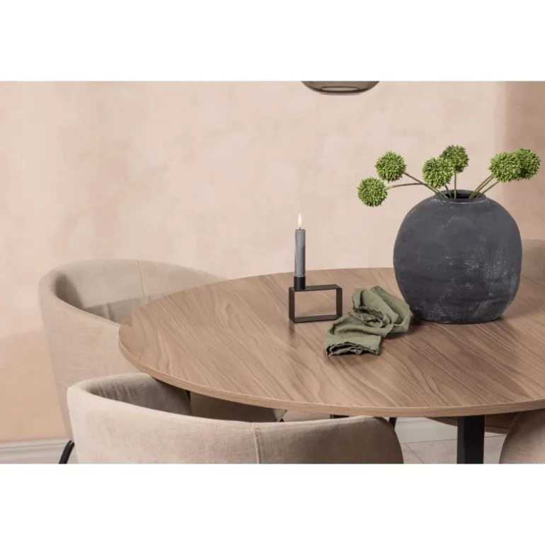 - Rundt spisebord: Valnøddefarvet bordplade i MDF med sorte stålben.