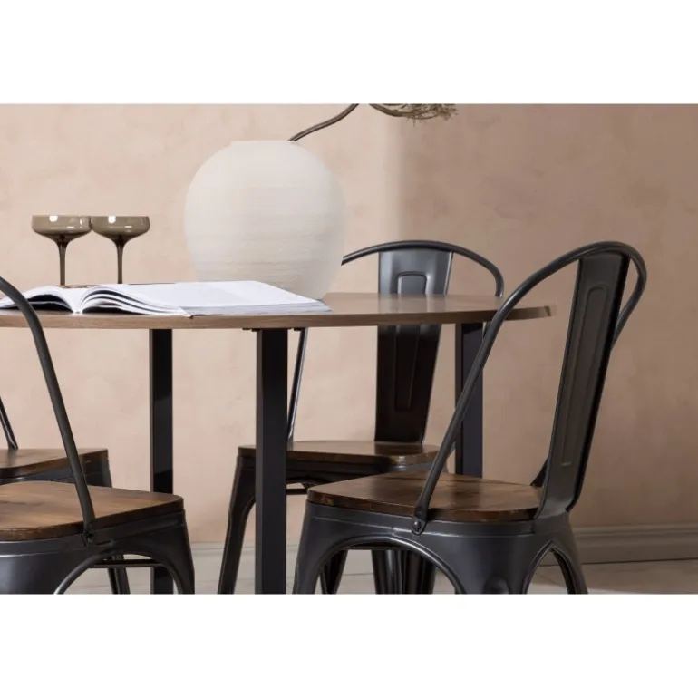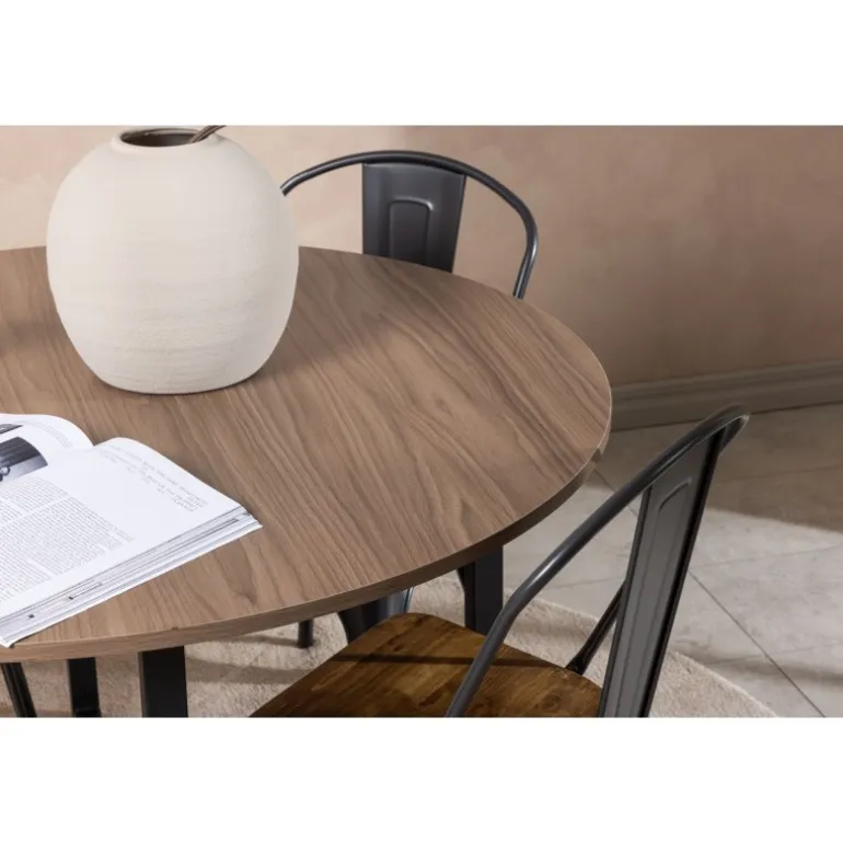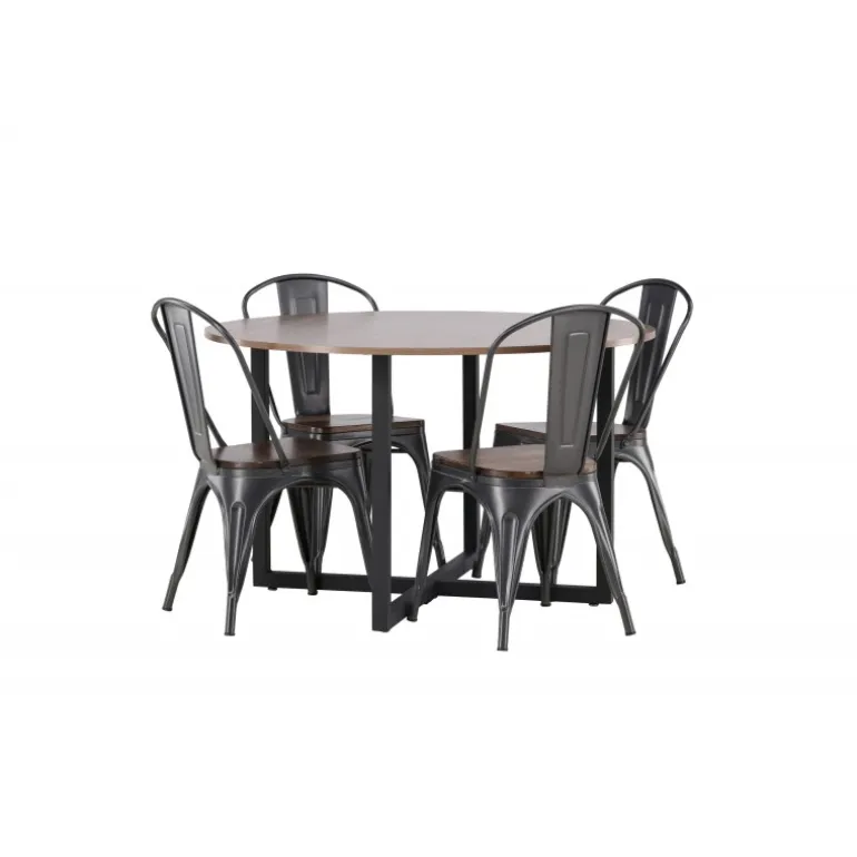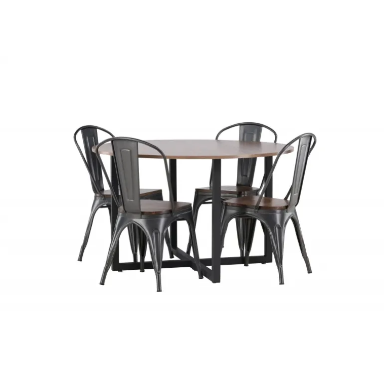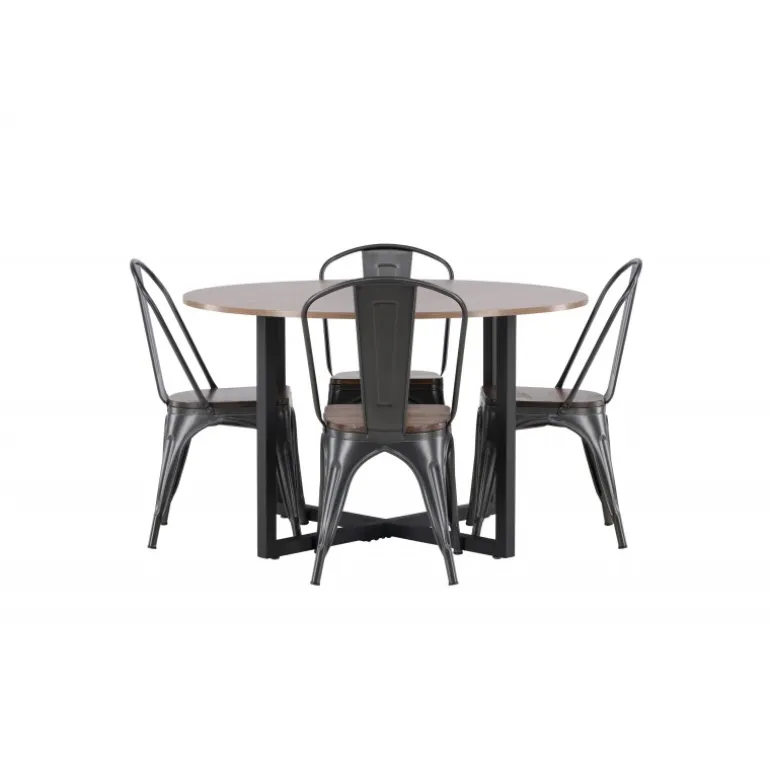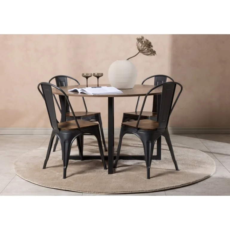 En tidløs Spisebordssæt med bløde former. Vores runde Durango spisebord har en valnød-farvet bordplade i MDF og lige bordben i sort stål, der samles i et kryds på gulvet. Her præsenteres det i en stilfuld kombination med trendy stole fra Tempe-serien. Stolen har et klassisk design af en rustik stol med let udskårne ben i mørkegrå stål og et sæde i mørkt træ. Det er stilfuldt og luksuriøst! Bordets dimensioner: 120 cm.