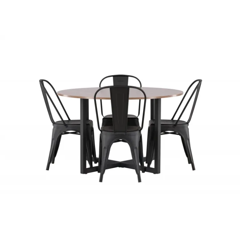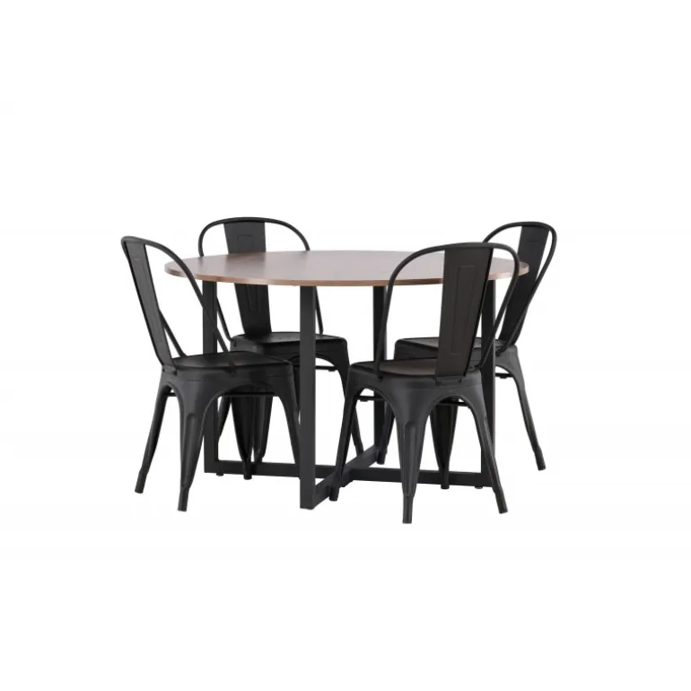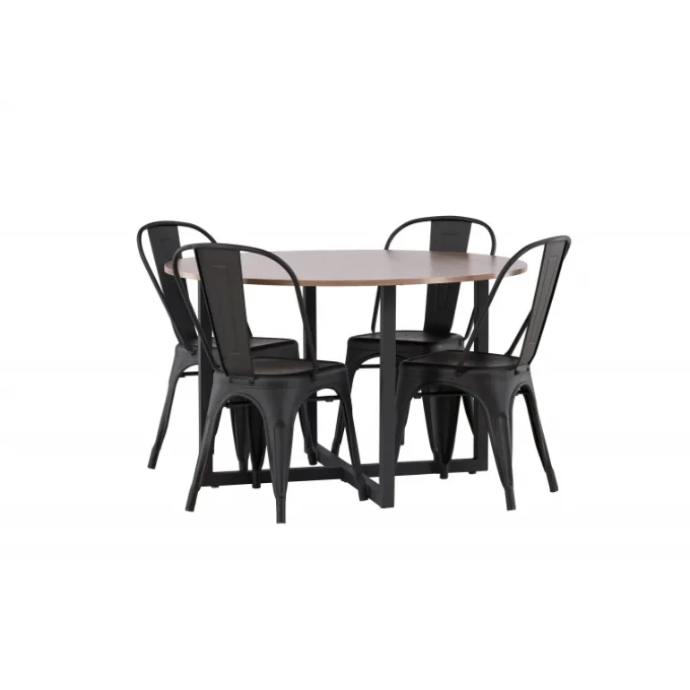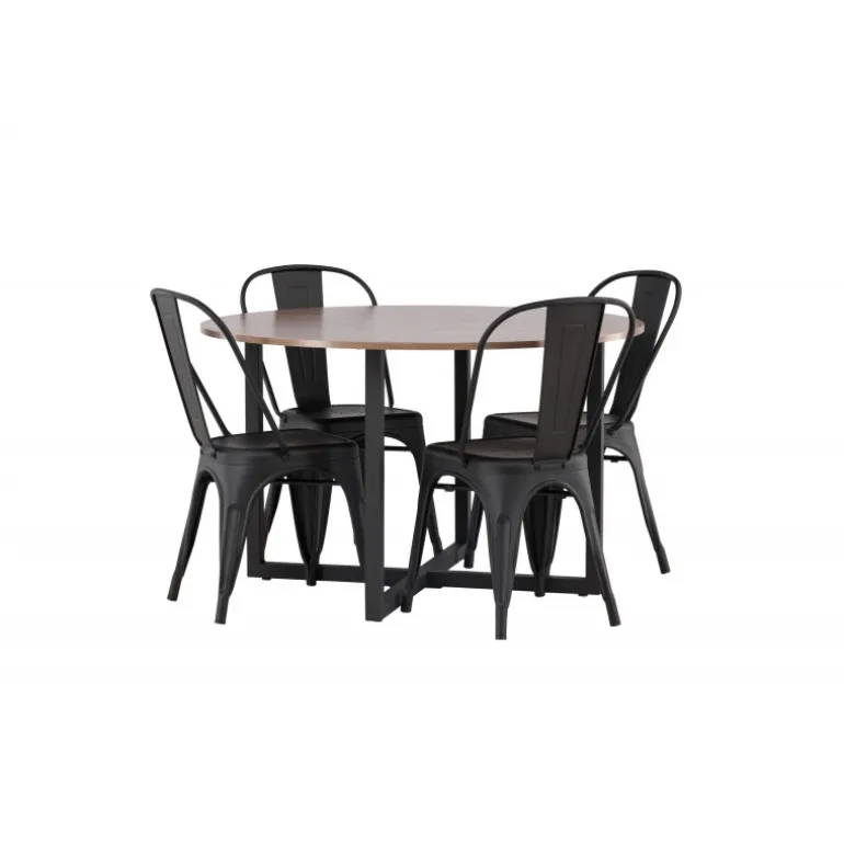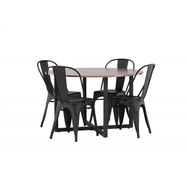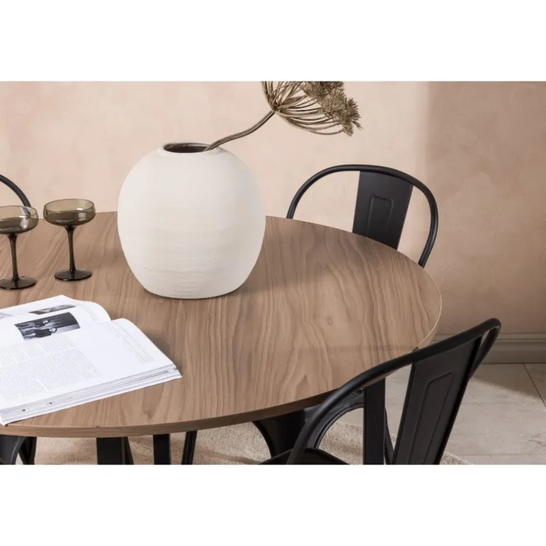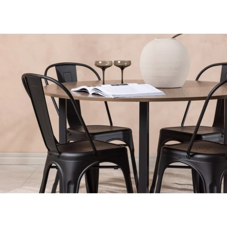 Kombinér jordfarver med trendy former! Vores runde Durango spisebord har en valnøddefarvet bordplade i MDF og lige bordben i sort stål, som samles i et kryds på gulvet. Her sammen med vores sorte spisebordsstole fra Tempe serien. Stolen har let skrånende ben, der smukt møder sædet og ryggen i et stilfuldt design, konsekvent lavet af sort metal. Indret hjemmets hjerte indbydende! Bordets dimensioner: 120 cm.