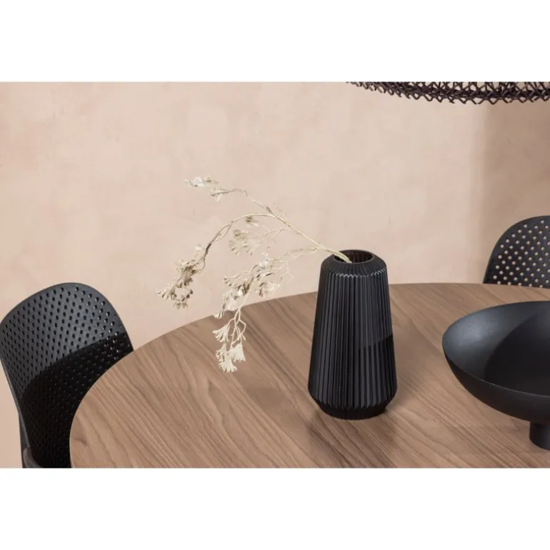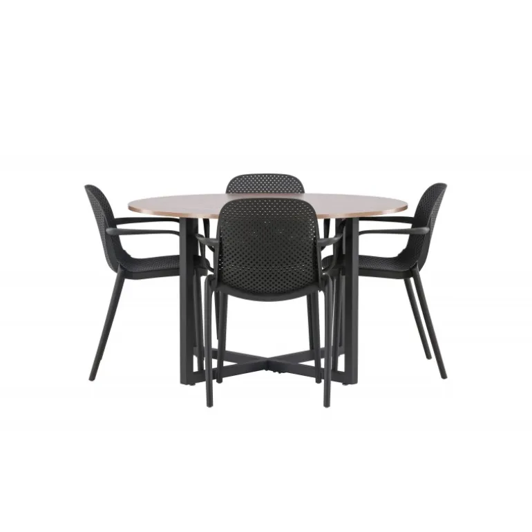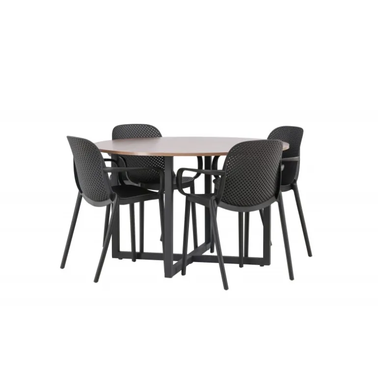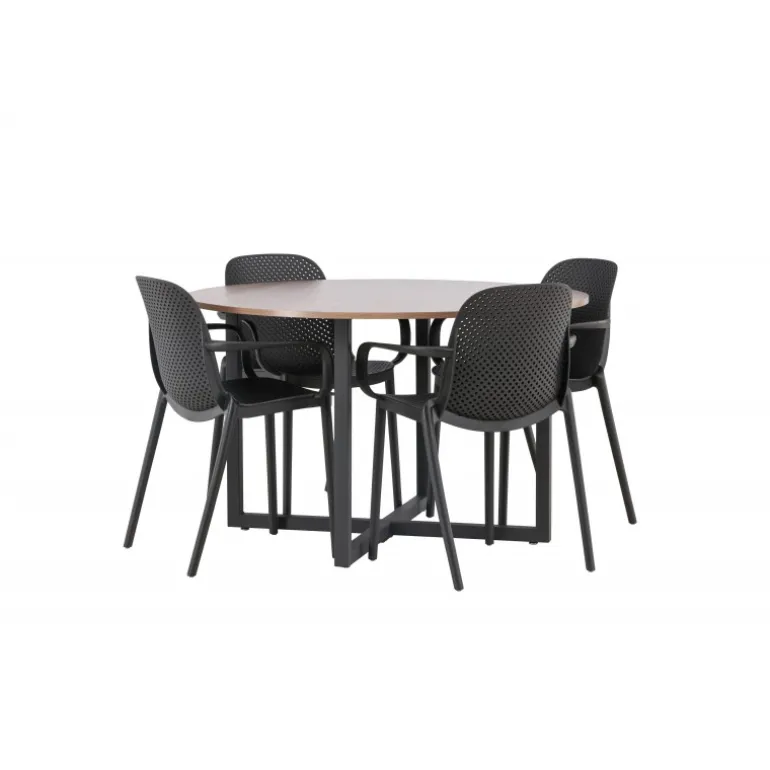 Her mødes industrielt design med bløde former! Vores runde Durango spisebord har en valnøddefarvet bordplade i MDF og lige bordben i sort stål, der samles i et kryds på gulvet. Sammen med vores smarte spisebordsstole fra Baltimore-serien skaber det en trendy og komfortabel spiseoplevelse. Stolen er lavet af sort plast og designet med lige nordiske former og integrerede armlæn for ekstra komfort. Sid behageligt og stilfuldt fremadrettet! Bordmål: 120 cm.