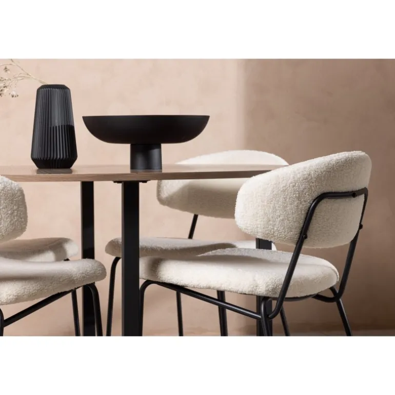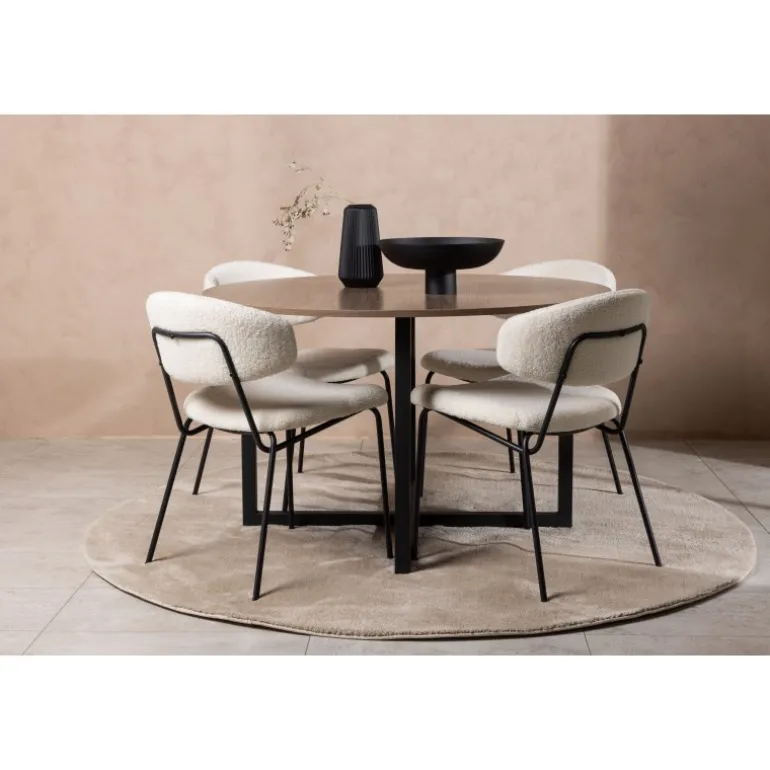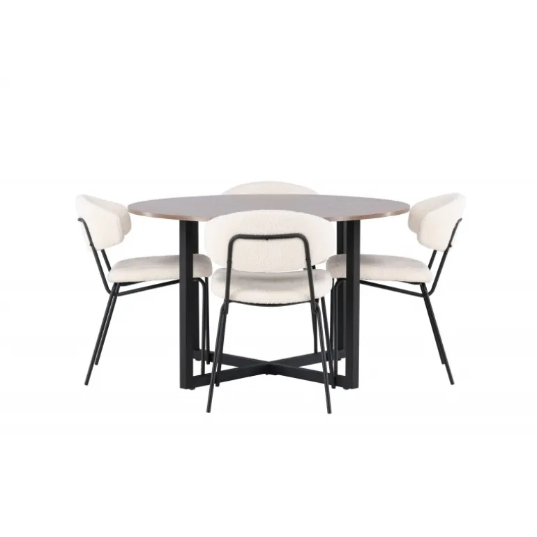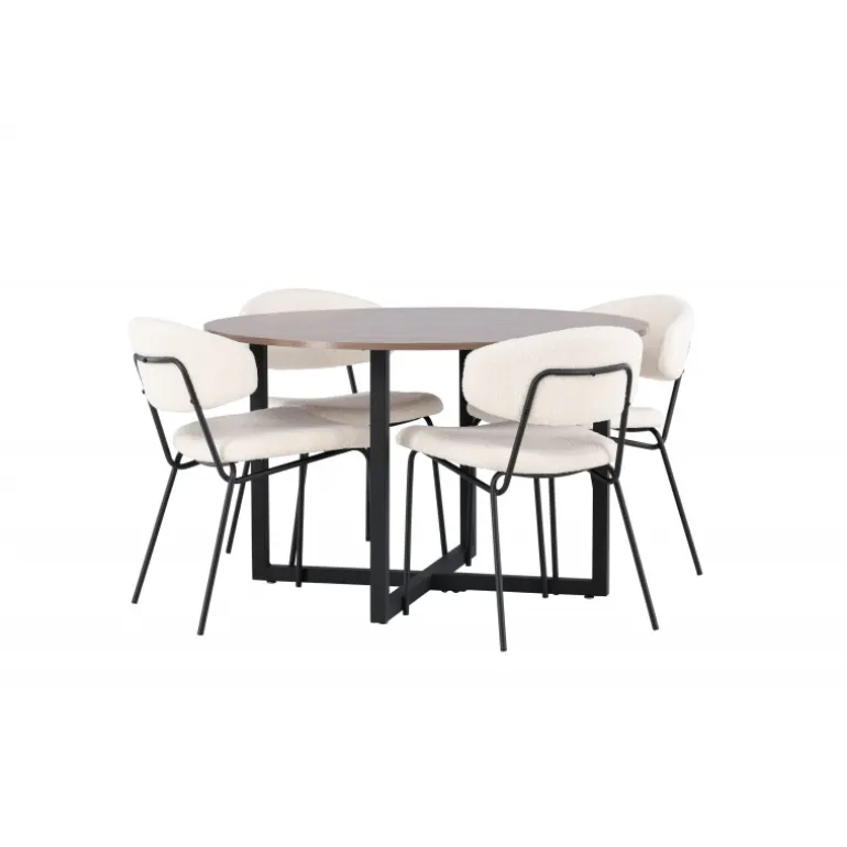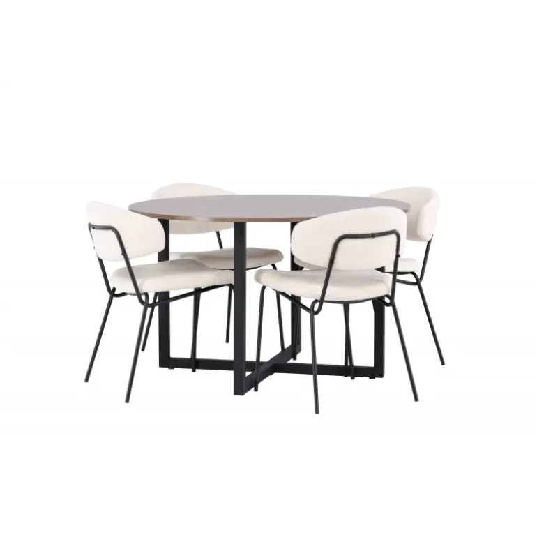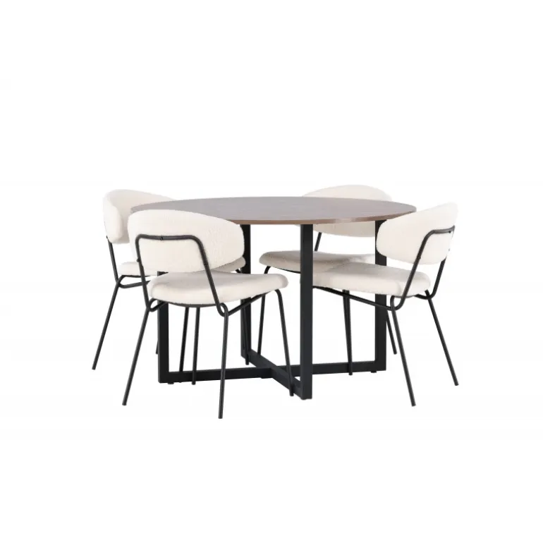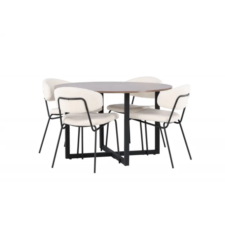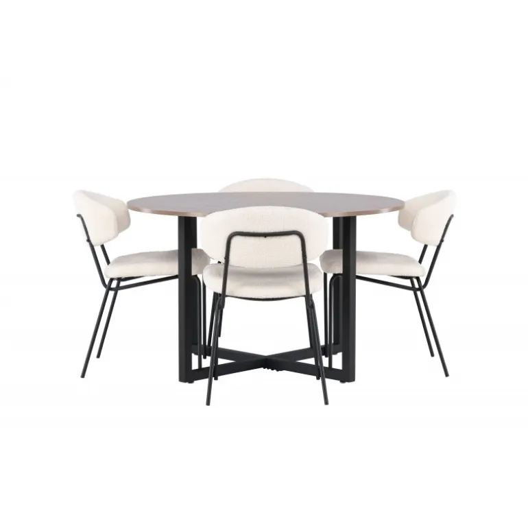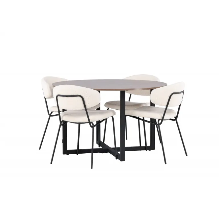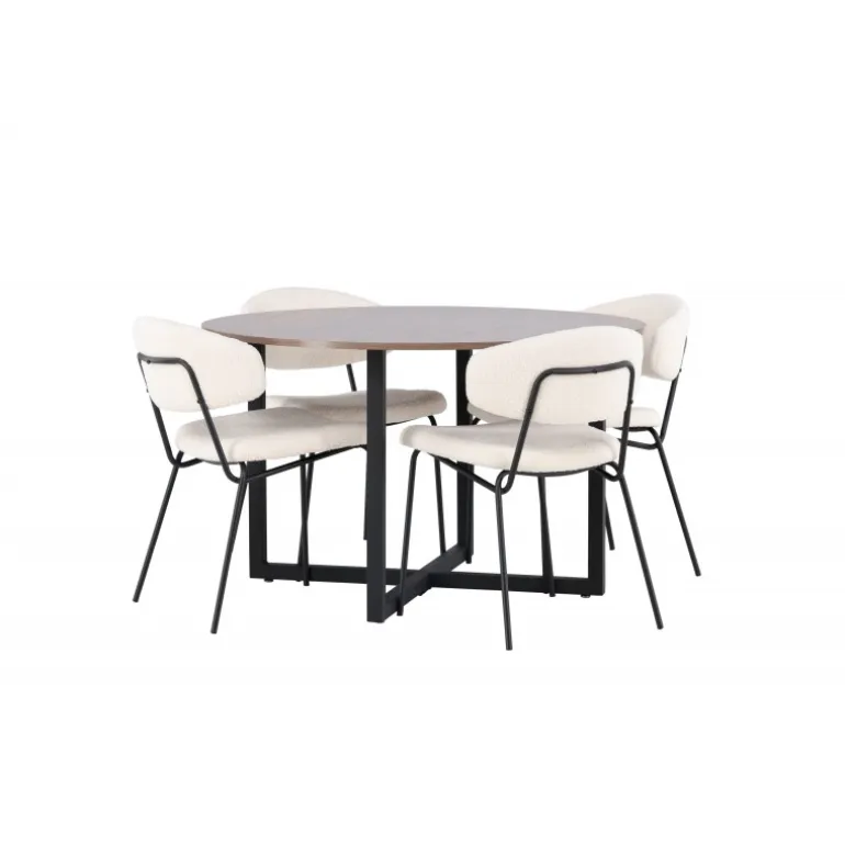 Oplev charme og bløde former med vores Durango Rundt Spisebordssæt! Dette sæt inkluderer et rundt spisebord med en valnøddefarvet bordplade i MDF og lige sorte stålben, der samles i et kryds på gulvet. Sammen med sættet får du vores vidunderlige, hvide spisestole fra Chico-serien. Stolene er lavet i hvid bouclé-stof med en polstret sæde og ryglæn for ekstra komfort. De smalle sorte stålben giver stolen et luftigt udseende. Skab en moderne blikfanger med en varm følelse! Borddimensioner: 120 cm.