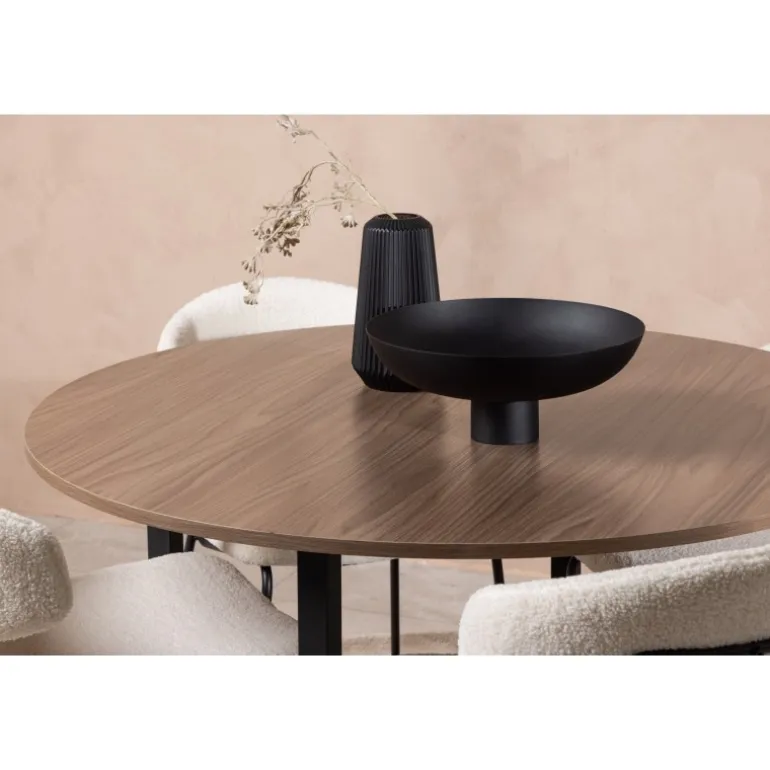 - Rundt Spisebord: Valnøddefarvet MDF bordplade og sorte stålben.