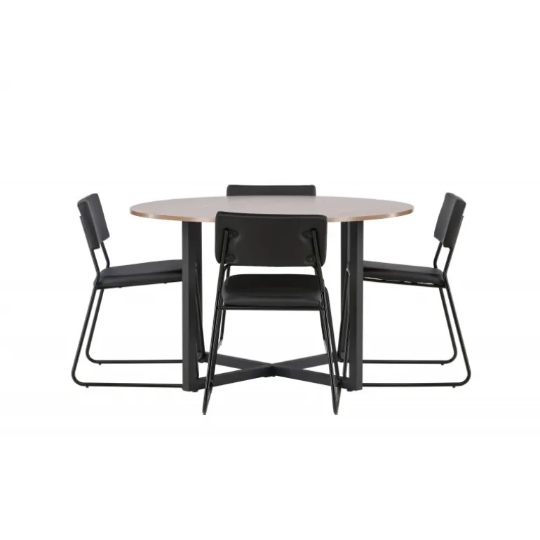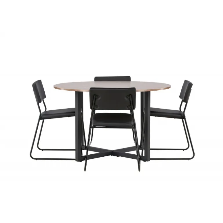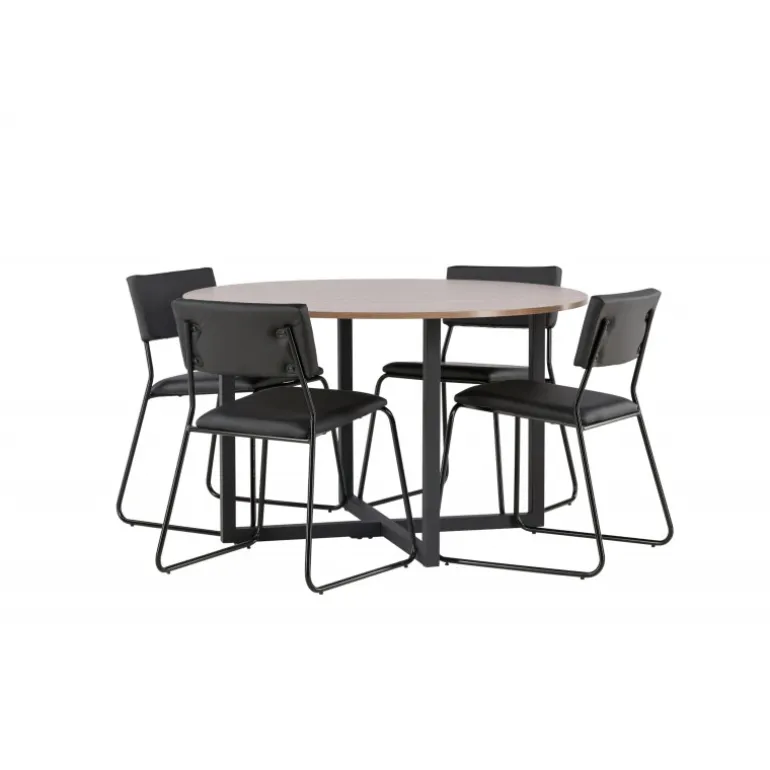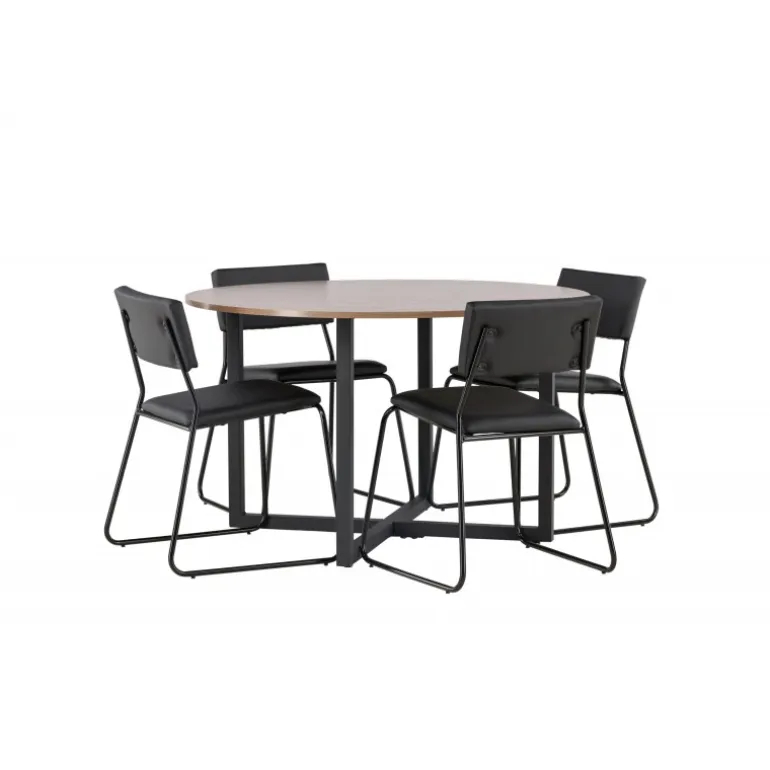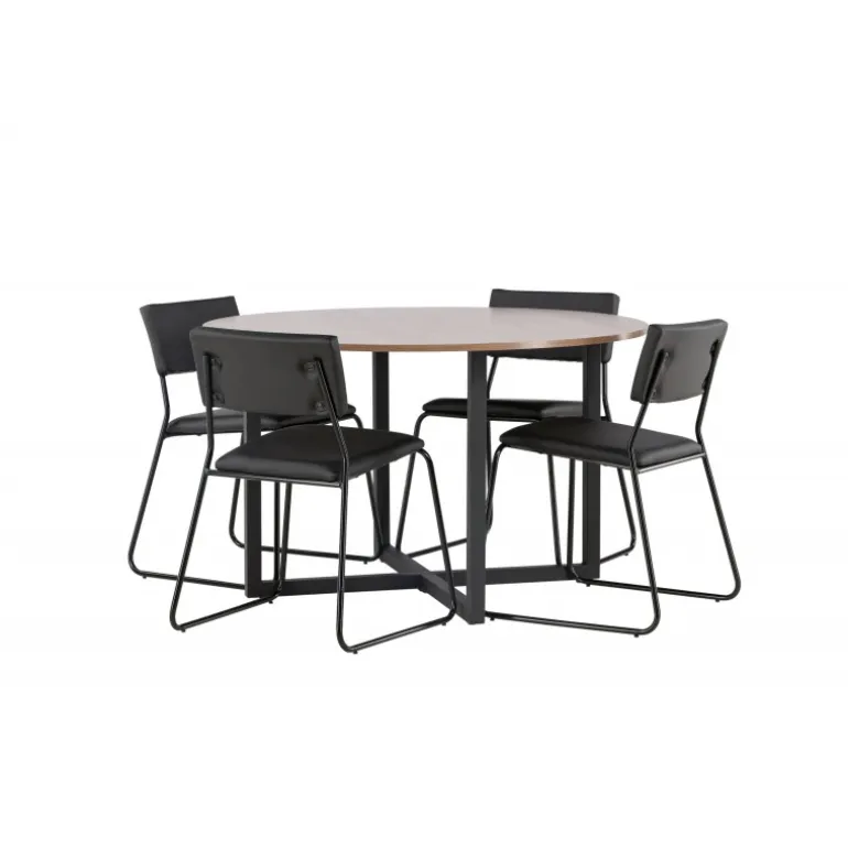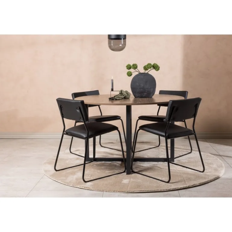 Minimalistisk og moderne! Vores runde spisebord Durango har en valnøddefarvet bordplade i MDF og lige bordben i sort stål, der samles i et kryds på gulvet. Her sammen med vores sorte spisebordsstole fra Kenth-serien. Det minimalistiske, moderne design skaber en luftig følelse. Stolen har en ryg og sæde i sort polyurethanlæder og polyester samt dekorative, smalle ben i jern. Her får du en gennemtænkt Spisebordssæt med en modebevidst følelse! Bordets diameter: 120 cm.