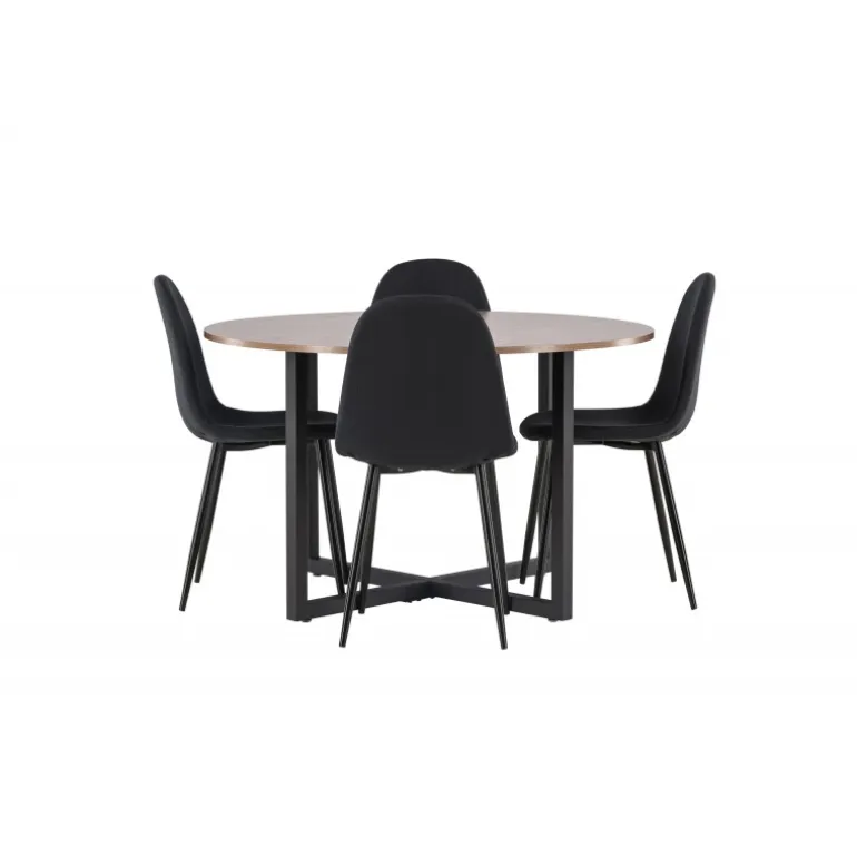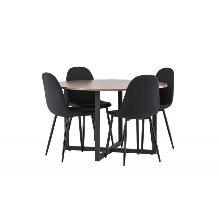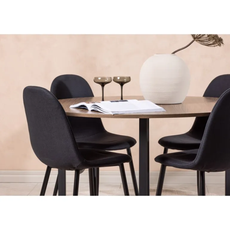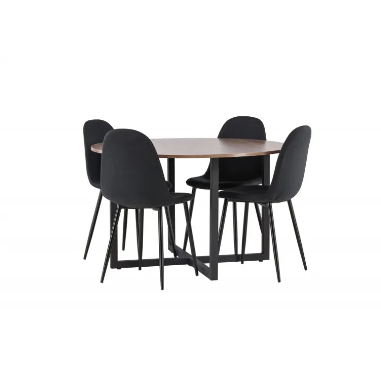 En sort Spisebordssæt med trendy detaljer! Vores runde spisebord Durango har en valnødfarvet bordplade i MDF og lige bordben i sort stål, der samles i et kryds på gulvet. Her er bordet kombineret med sorte spisebordsstole fra Polar-serien. Stolen har et rundet design med et klassisk udtryk – lige så praktisk som tidløst. Ryglæn og sæde er polstret med sort polyesterstof og benene er i sort pulverlakeret metal. Her får du en tidløs Spisebordssæt! Bordets dimensioner: 120 cm.
