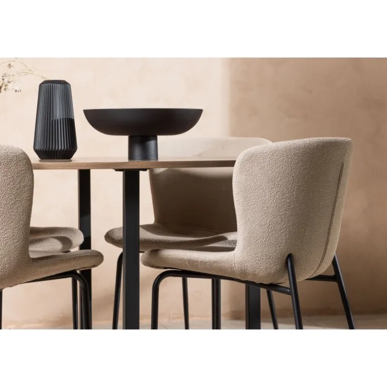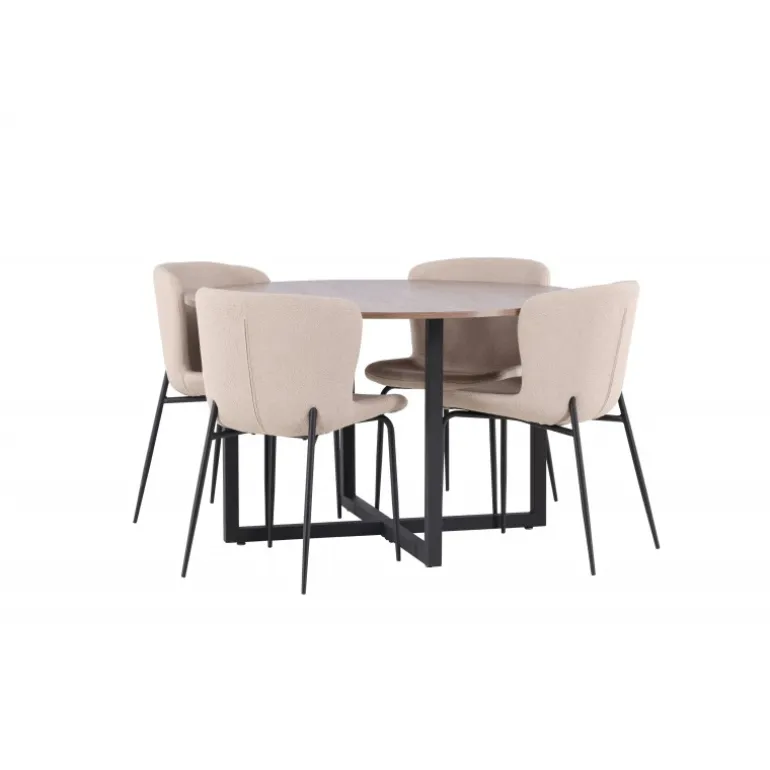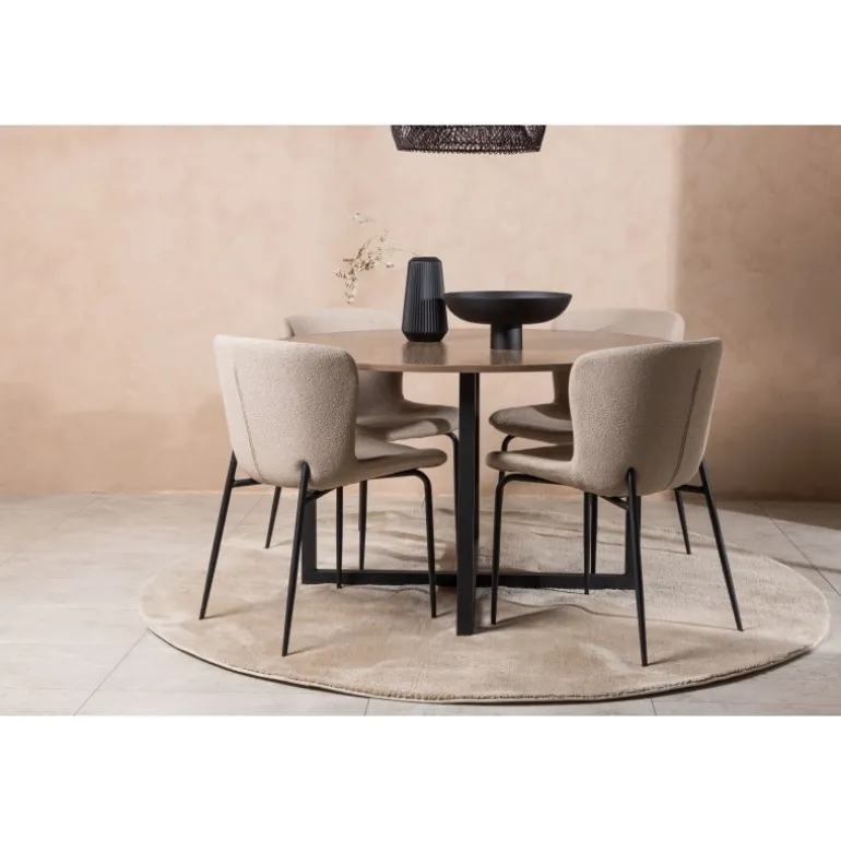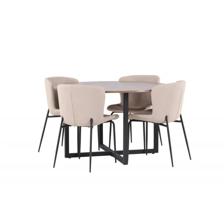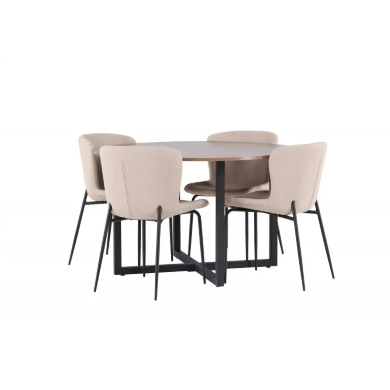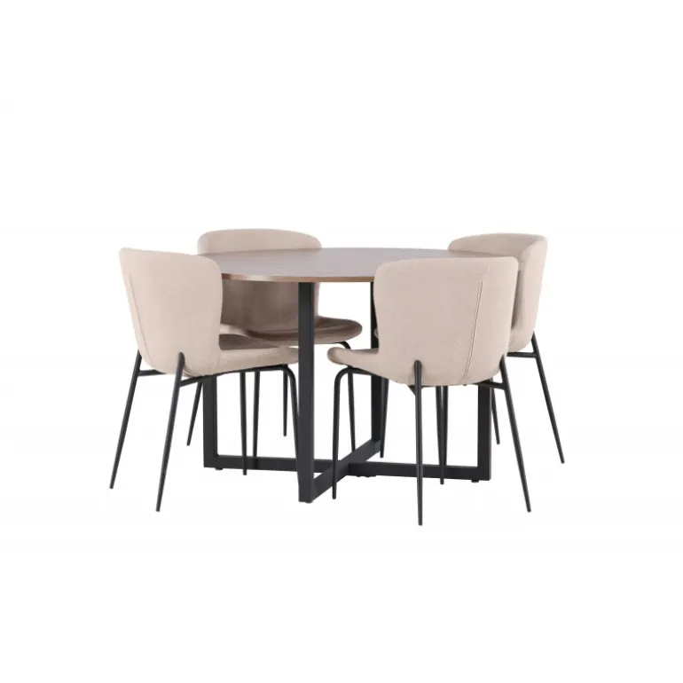 Møbler luksuriøst og indbydende! Vores runde spisebord Durango har en valnøddefarvet bordplade i MDF og lige bordben i sort stål, der samles i et kryds på gulvet. Her sammen med de modebevidste spisebordsstole fra Modesto-serien. Stolen er fuldt polstret i beige plys stof med stilfulde smalle stoleben i sort metal. Den let afrundede ryg og polstrede sædepude giver ekstra komfort og forlænger hyggelige måltider rundt om spisebordet. Det bliver ikke bedre end dette! Bordmål: 120 cm.