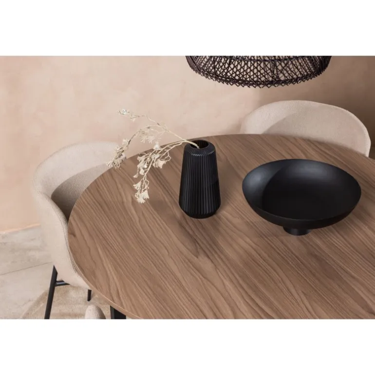 - Rundt spisebord med valnøddefarvet bordplade i MDF og sorte stålben.