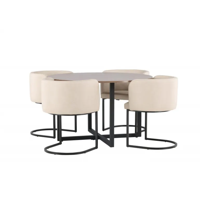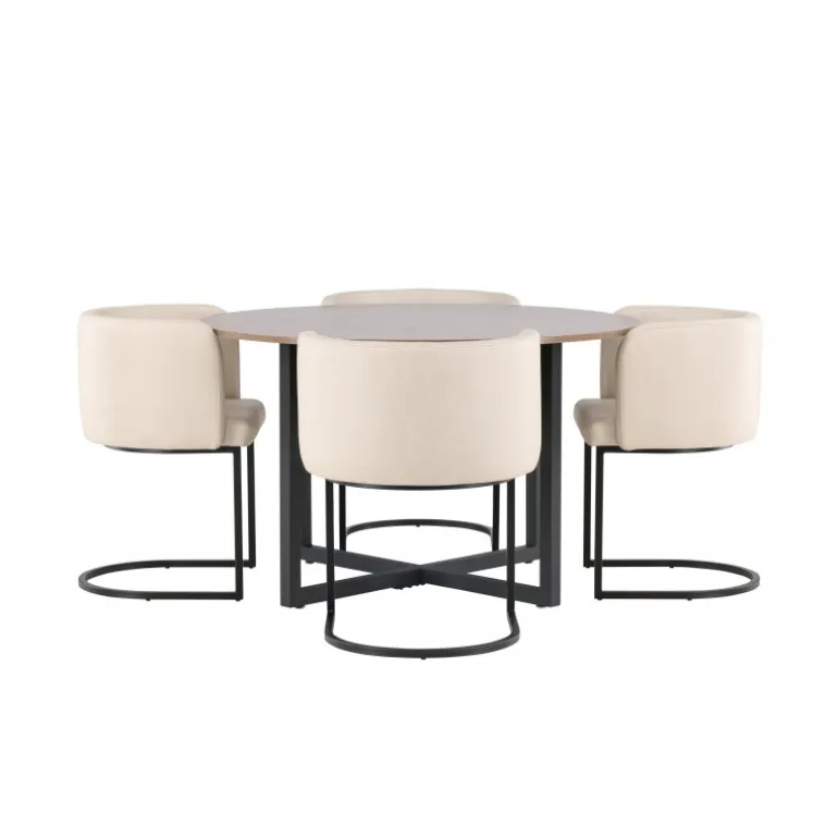 En spisestuegruppe med indbydende former og stilfuldt design! Vores runde Durango spisebord har en valnøddefarvet bordplade i MDF og lige bordben i sort stål, som samles i et kryds på gulvet. Her i vidunderlig kombination med vores luksuriøse spisestuestole Simrishamn. Stolen har et fuldt polstret sæde med en afrundet ryglæn i beige TC-stof og dekorative, minimalistiske ben i sort stål. Skab en storslået og elegant blikfang! Borddimensioner: 120cm.