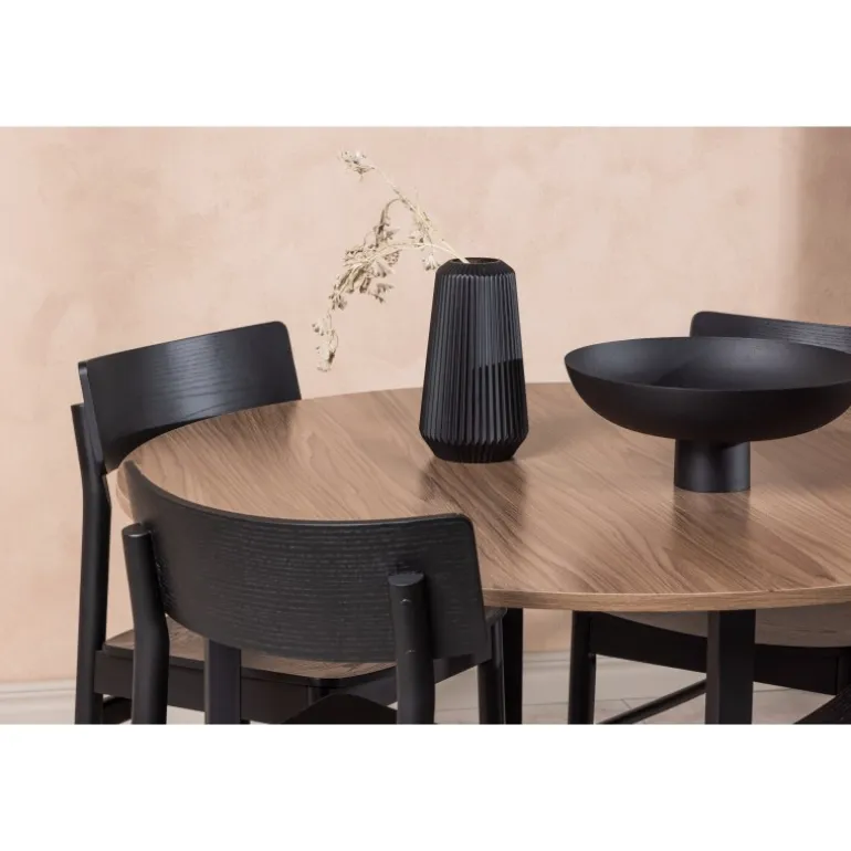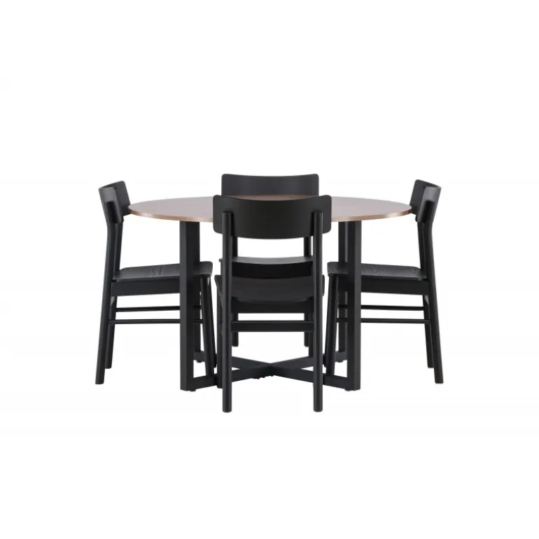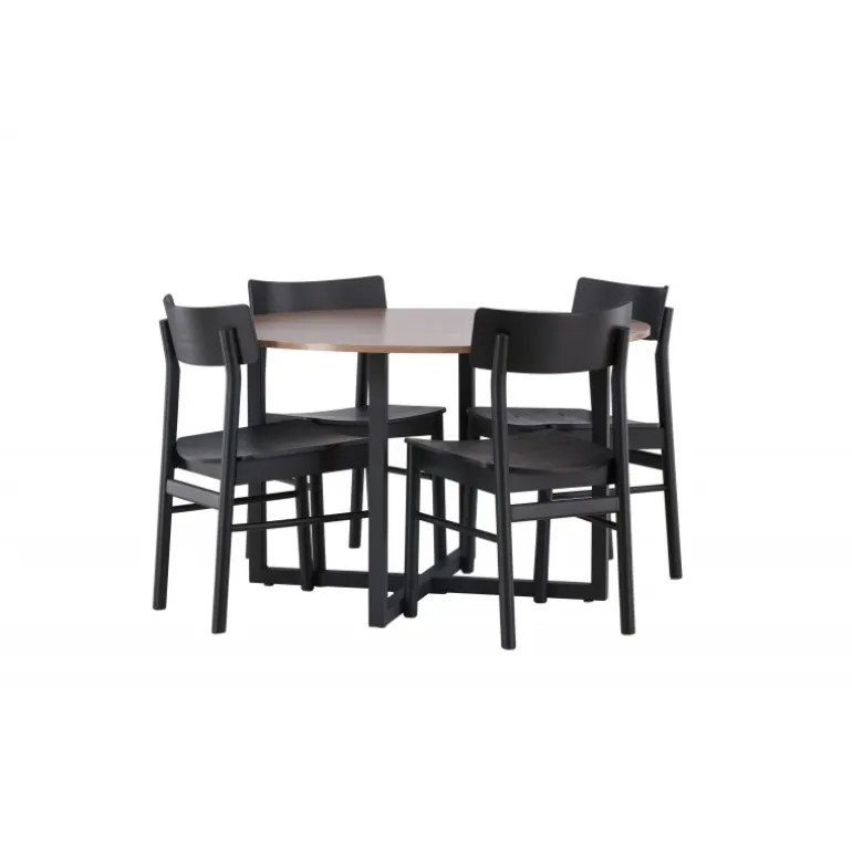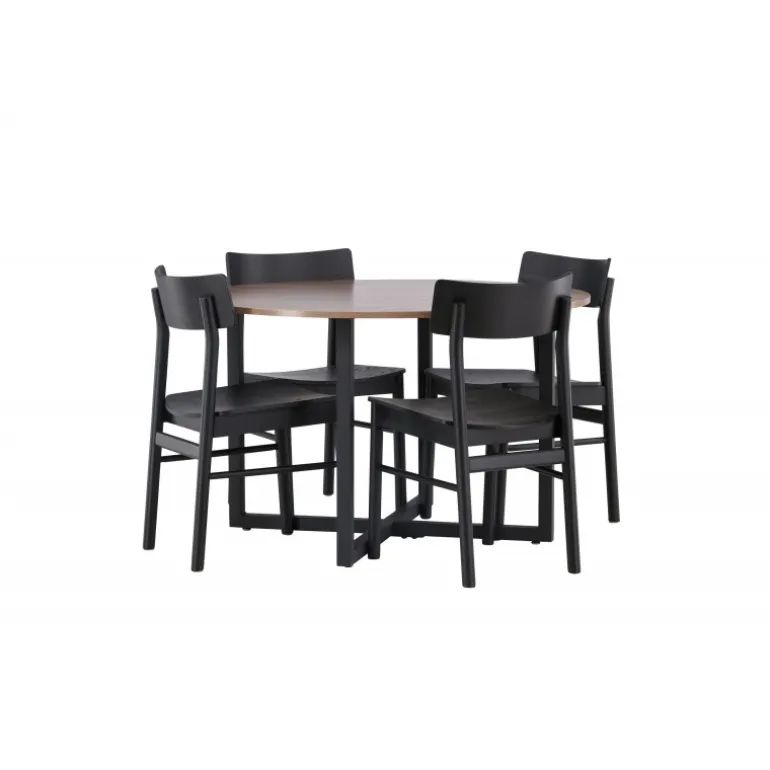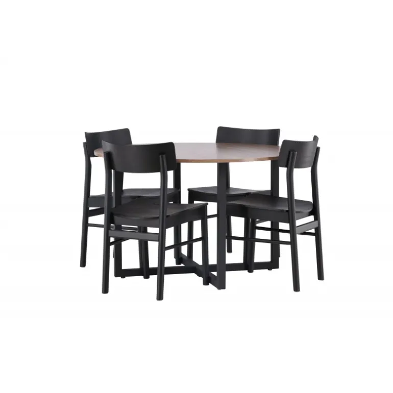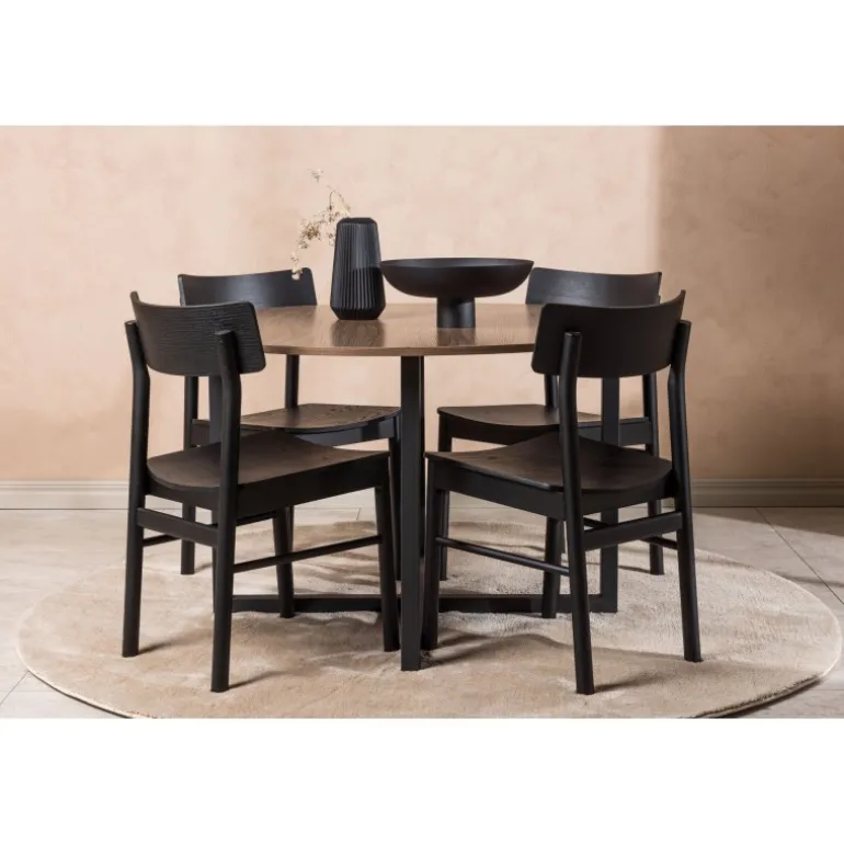 Opdag det stilfulde spisebordssæt, der vil forvandle din spisestue til et elegant og indbydende rum for måltider og sammenkomster. Med vores Durango spisebord og Montros stole får du både stil og funktionalitet. Durango bordet har en imponerende diameter på 120 centimeter og er lavet af MDF-materiale. Benene er fremstillet af sort stål, hvilket tilføjer et moderne touch til det elegante valnøddefarvede bord. Montros stolene er ikke kun elegante, men også komfortable, perfekt til lange samtaler ved spisebordet. Deres sorte farve og birkeramme giver et tidløst og stilfuldt udtryk til hele spisebordssættet. Uanset om det er en intim middag med familien eller en festlig sammenkomst med venner, tilbyder vores spisebordssæt det perfekte sted til enhver lejlighed. Opgrader din spisestue i dag og lad vores spisebordssæt blive en central del af dit hjem.