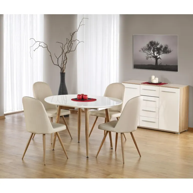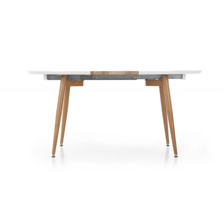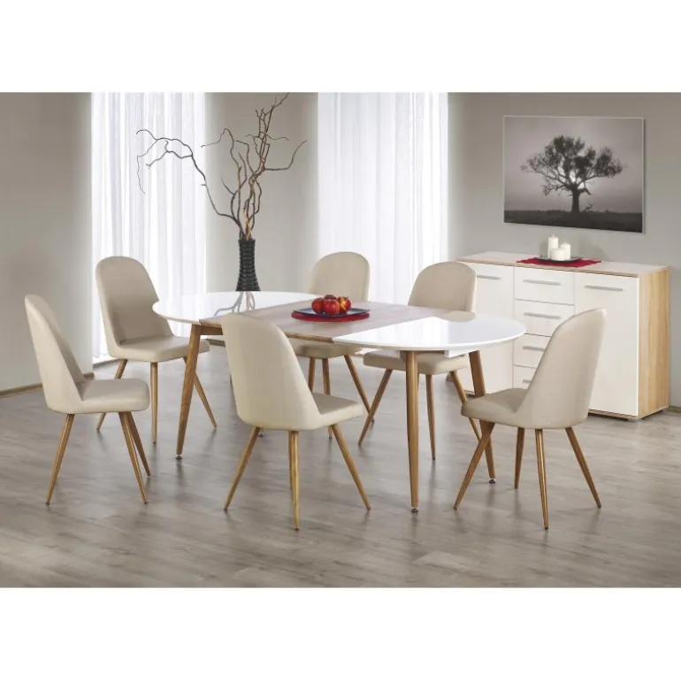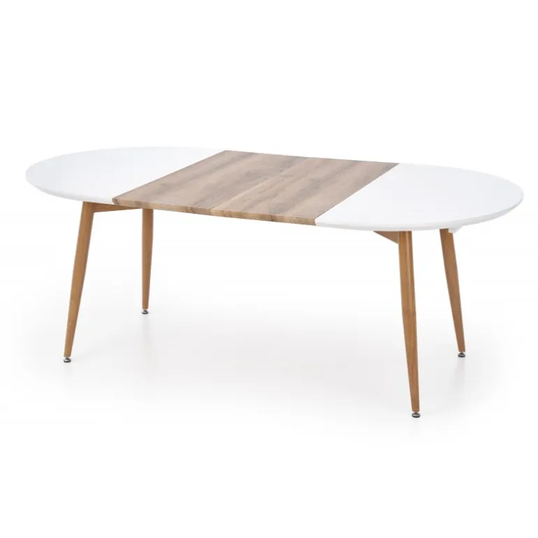 Oplev den perfekte balance mellem stil og funktionalitet med EDWARD Spisebord med udtræk i farven honningeg. Dette bord er ideelt til både små og store sammenkomster, da det kan udvides fra 120 cm til 200 cm. Lavet af lakeret MDF, lamineret MDF og malet stål, tilbyder dette bord både holdbarhed og elegance. Bordets top kommer i en smuk kombination af hvid og honningeg, mens benene er færdiggjort i honningeg, der tilføjer en varm og indbydende atmosfære til dit hjem.