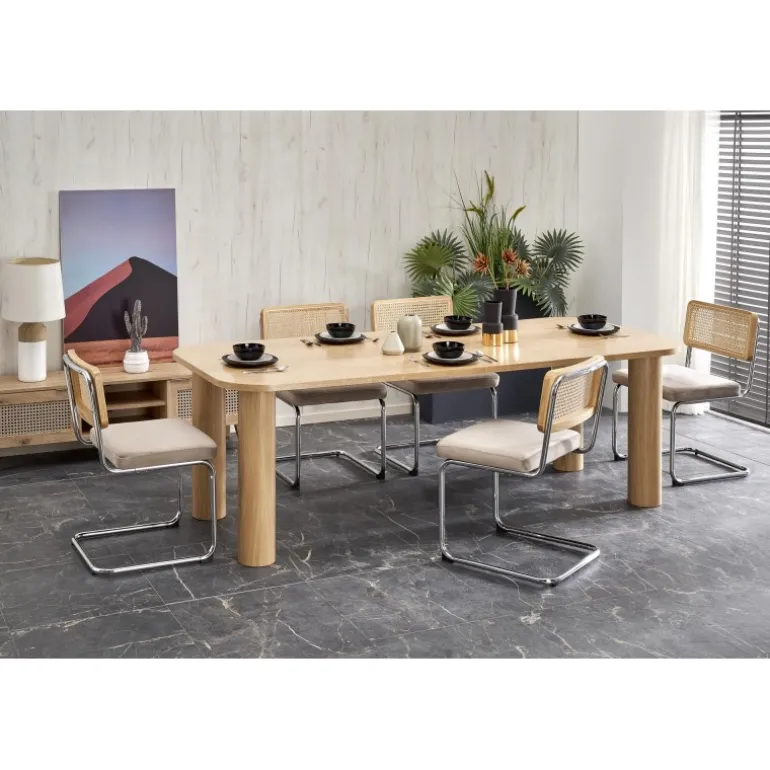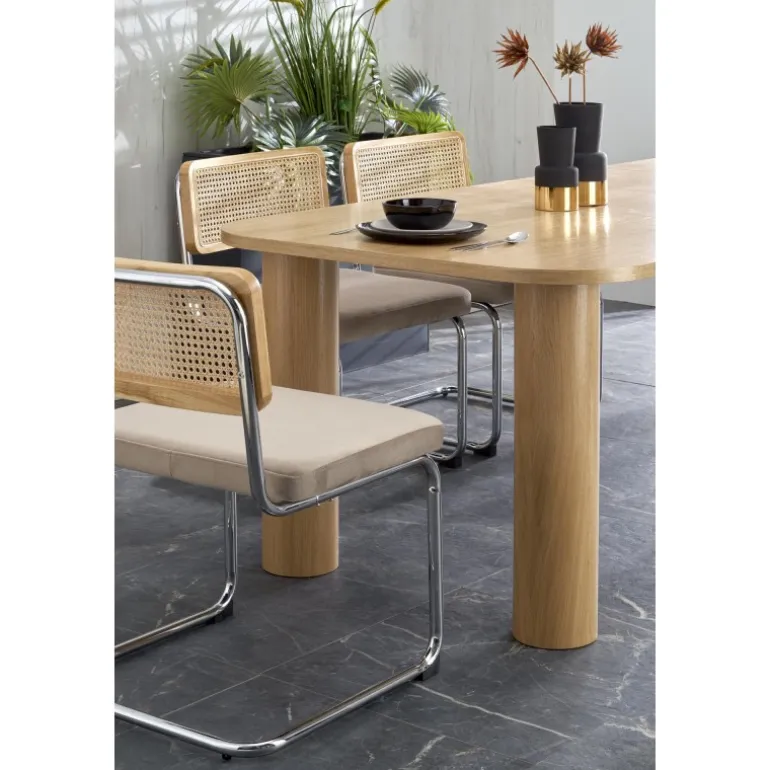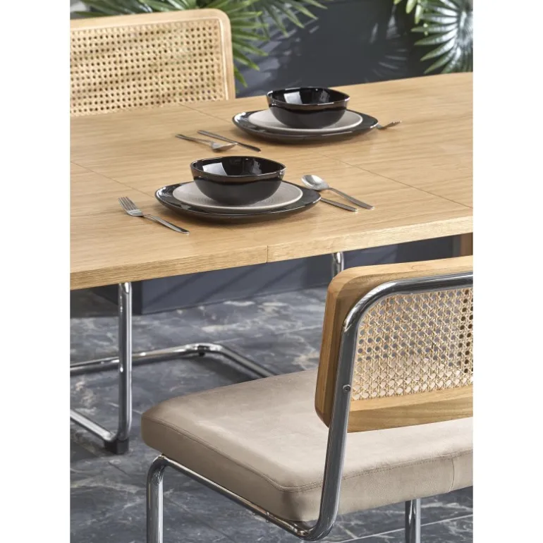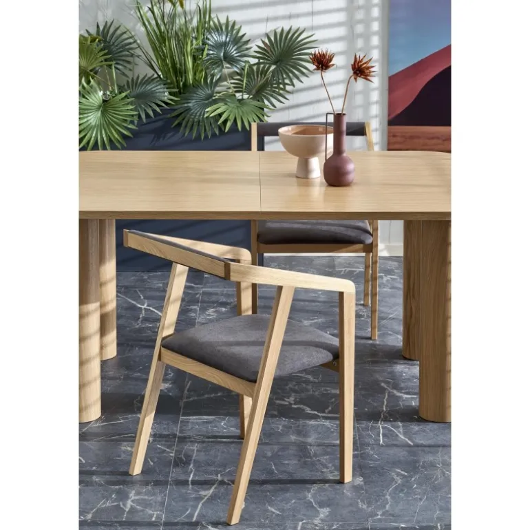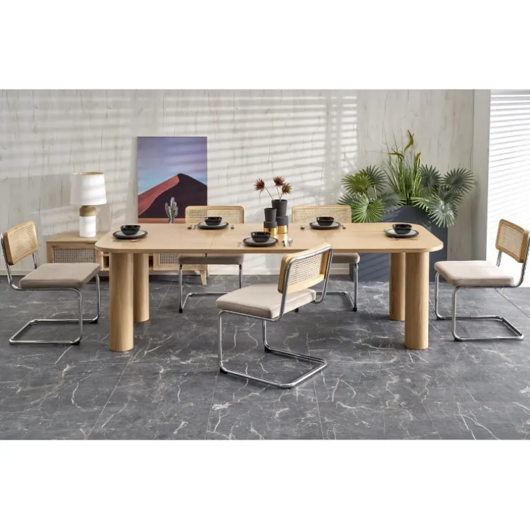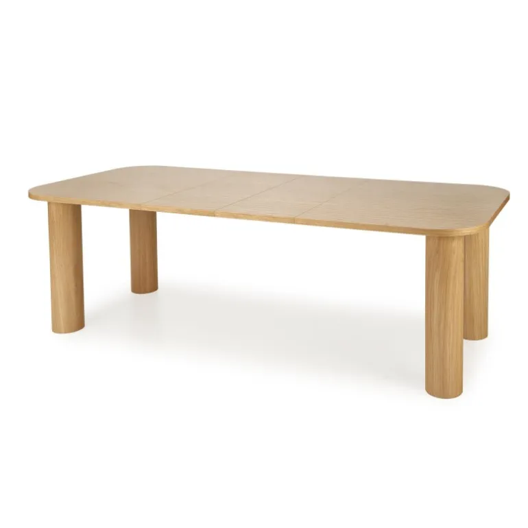 ELEFANTE REKTANGULÆR Spisebord med udtræk i naturlig eg er det perfekte valg til din spisestue. Med dimensionerne 160-240/100/77 cm kan dette bord nemt udvides for at imødekomme flere gæster. Fremstillet af MDF med en naturlig egefinér, kombinerer det både holdbarhed og elegance. Bordets naturlige egefarve tilføjer et tidløst og sofistikeret udseende til ethvert rum.