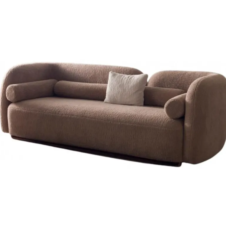 Denne sofa kombinerer et moderne og roligt design med indbydende komfort. De afrundede former og det bløde stof giver et varmt og harmonisk udtryk, som passer smukt ind i både lyse og moderne stuer.