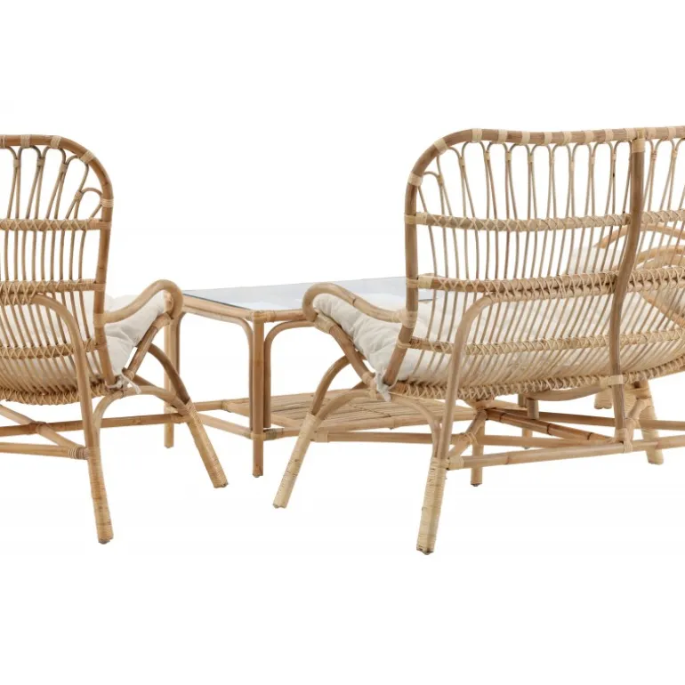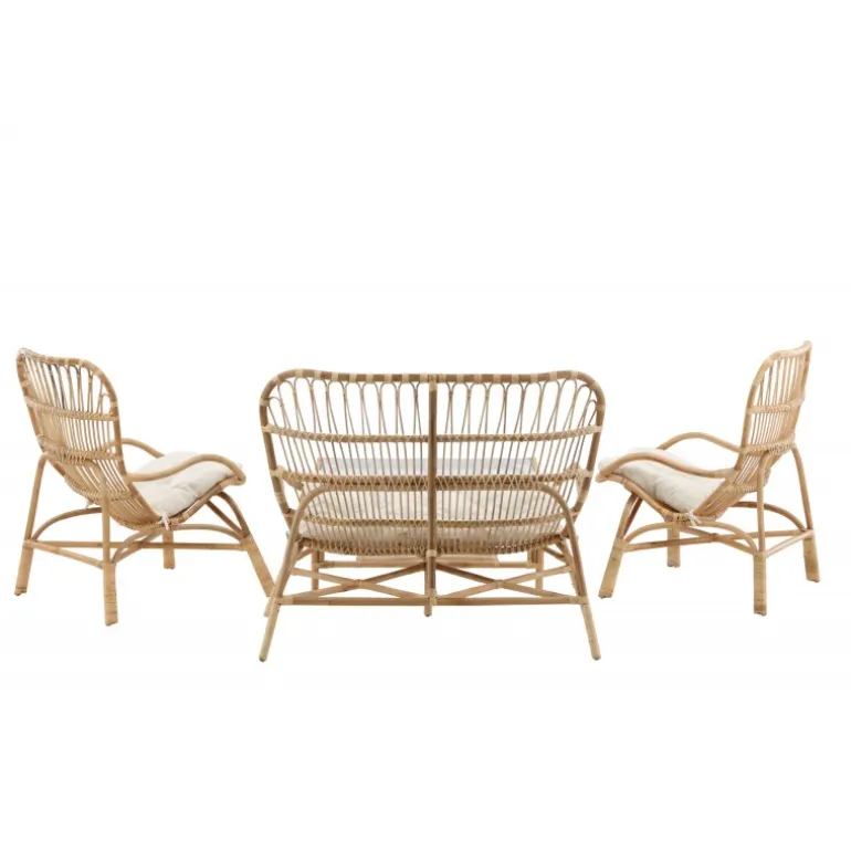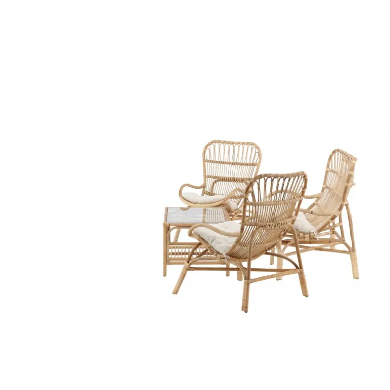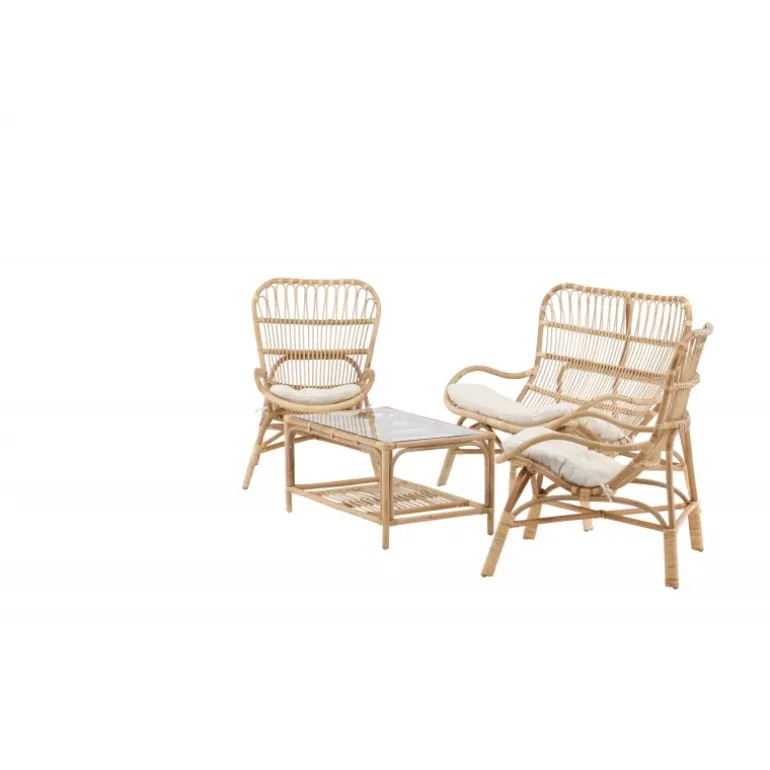 Loungegruppen Ella er en indbydende møbelgruppe med fokus på komfort, lavet af stærk og holdbar naturrattan – passer perfekt på den glaserede terrasse. Møbelgruppen består af en to-personers sofa, to rammestole med fine detaljer inklusive hvide plukkede sædehynder. Derudover er der et rektangulært sofabord med en stilfuld glasbordplade og en mindre hylde perfekt til opbevaring. Det naturlige materiale giver hvert enkelt møbel et unikt karakter og skaber et varmt blikfang. Plejeanvisning: Et naturligt materiale, der er utrolig flot og trendy, men ikke særlig vejrbestandigt. Rattanmøbler bør helst ikke stå udendørs, men placeres i tørre rum. Undgå store temperaturudsving. Den nemmeste rengøring foretages med en fugtig klud.