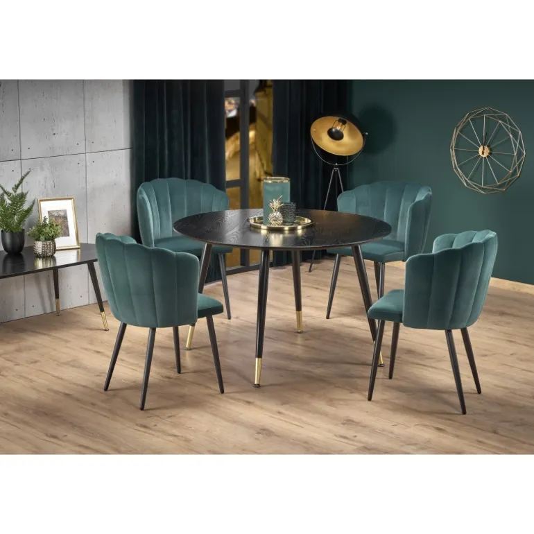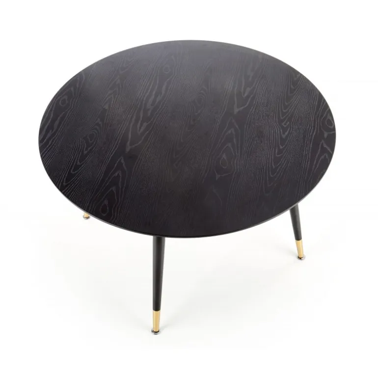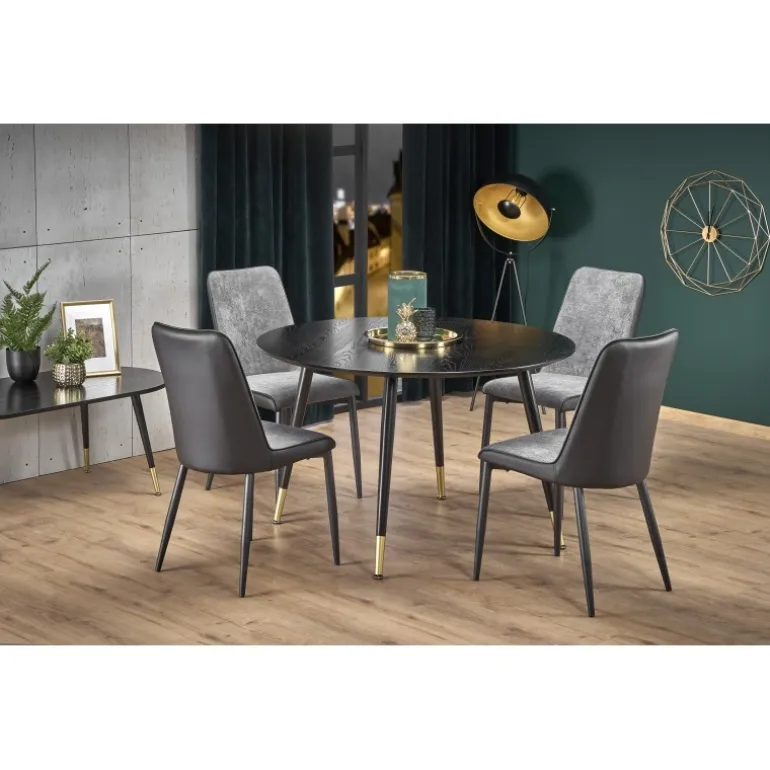 Oplev det elegante EMBOS bord, designet til at tilføre et strejf af sofistikeret stil til dit hjem. Dette moderne bord har en rund top på 120 cm i diameter, fremstillet af lakeret MDF, der giver det en glat og holdbar overflade. Benene er skabt af pulverlakeret og forkromet stål, som sikrer stabilitet og et luksuriøst udseende. Med sin Sorte top og Sorte/guld ben kombinerer EMBOS bordet moderne design med tidløs elegance, perfekt til enhver stue, spisestue eller kontor.
