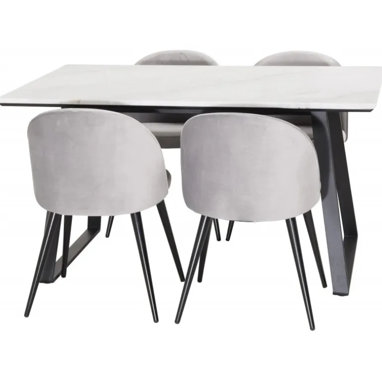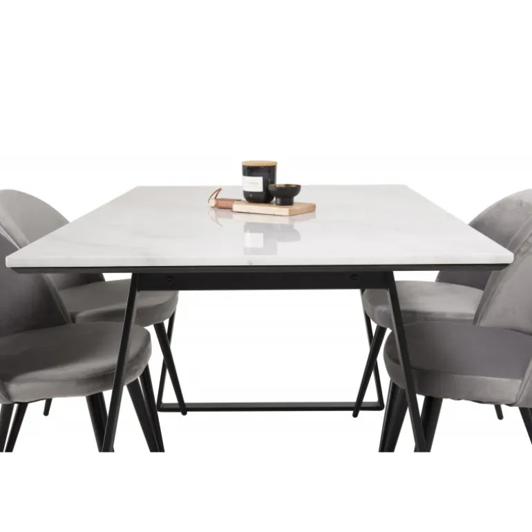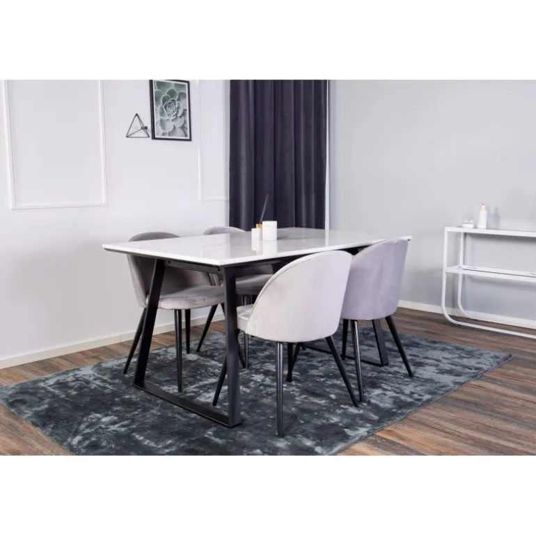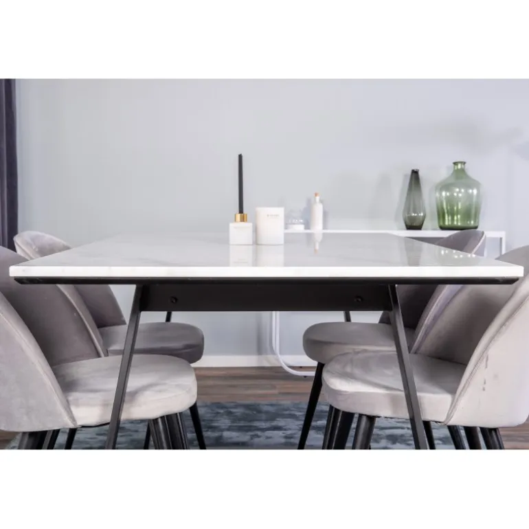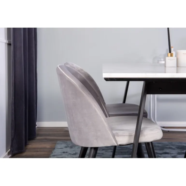 Kombinering af forskellige farver og materialer på stole og borde skaber ofte stor succes. Her får du et elegant spisebord fra Estelle og vores grå spisestuestole fra Serein Velvet – moderne, komfortable og tidløse.