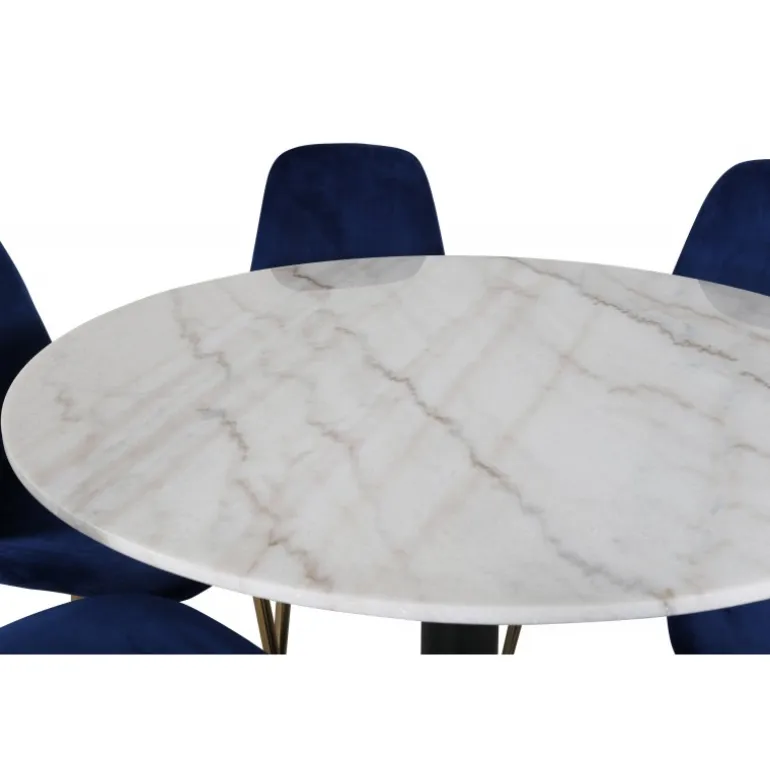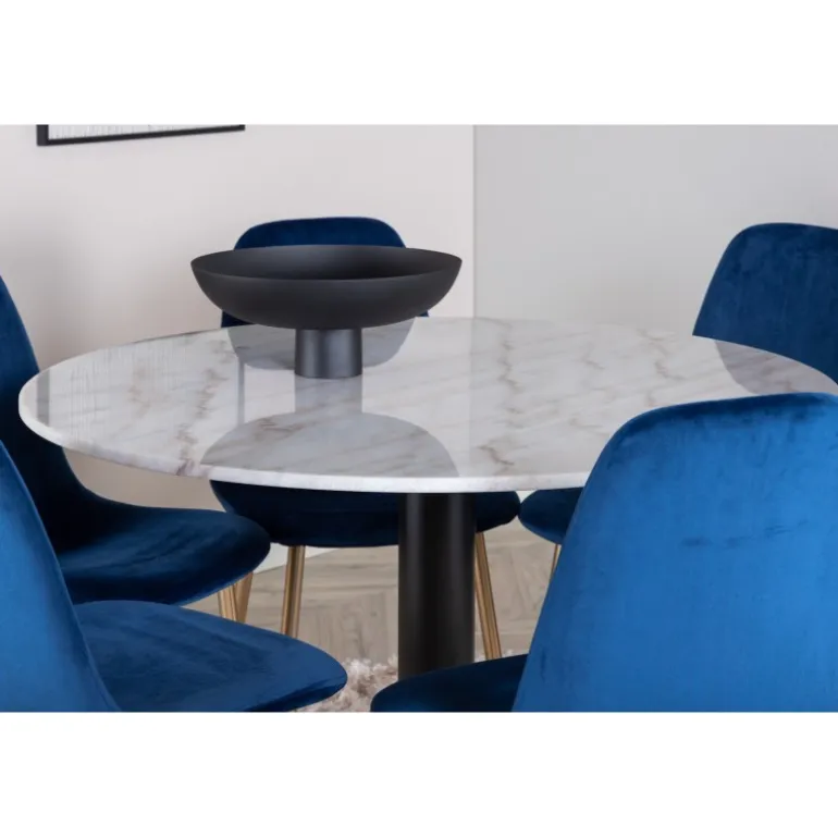 Estelle, moderne og stilrent spisebord – her sammen med spisestole i Polar-serien. Skab noget elegant og socialt med plads til god mad og hyggelige stunder! Dette sæt kombinerer et marmor spisebord med plywood og stål spisestole, hvilket giver et moderne og holdbart design. Perfekt til enhver spisestue, hvor stil og funktionalitet går hånd i hånd.
