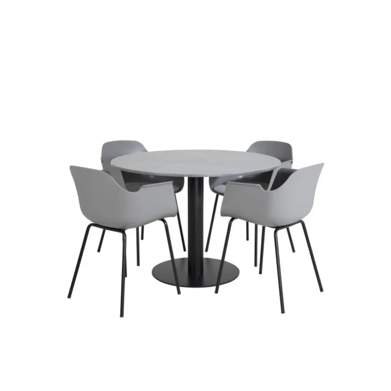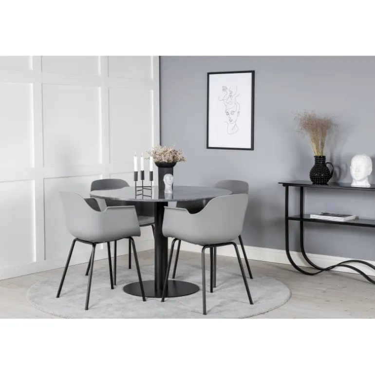 Spisebordet Estelle i et slankt design, kombineret med lækre spisebordsstole i Gemma-serien – den perfekte kombination for dem, der ønsker en moderne Spisebordssæt. Dette sæt inkluderer en rund marmorbordplade og komfortable stole med skumpolstring. Med dets elegante sorte og grå farver passer det perfekt ind i ethvert moderne hjem. Let at samle og bygget med holdbare materialer som stål, plastik, polyester, og skum, hvilket sikrer langvarig brug og komfort.
