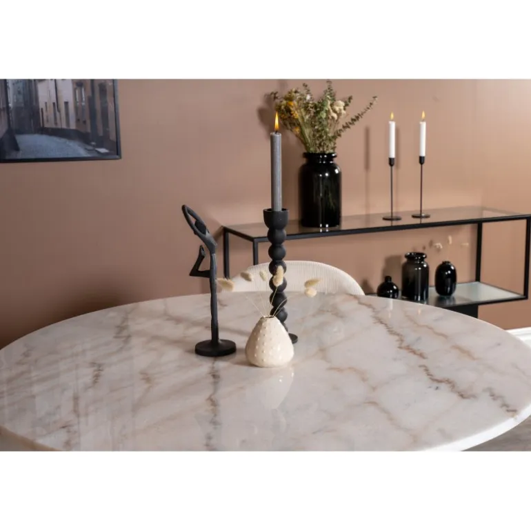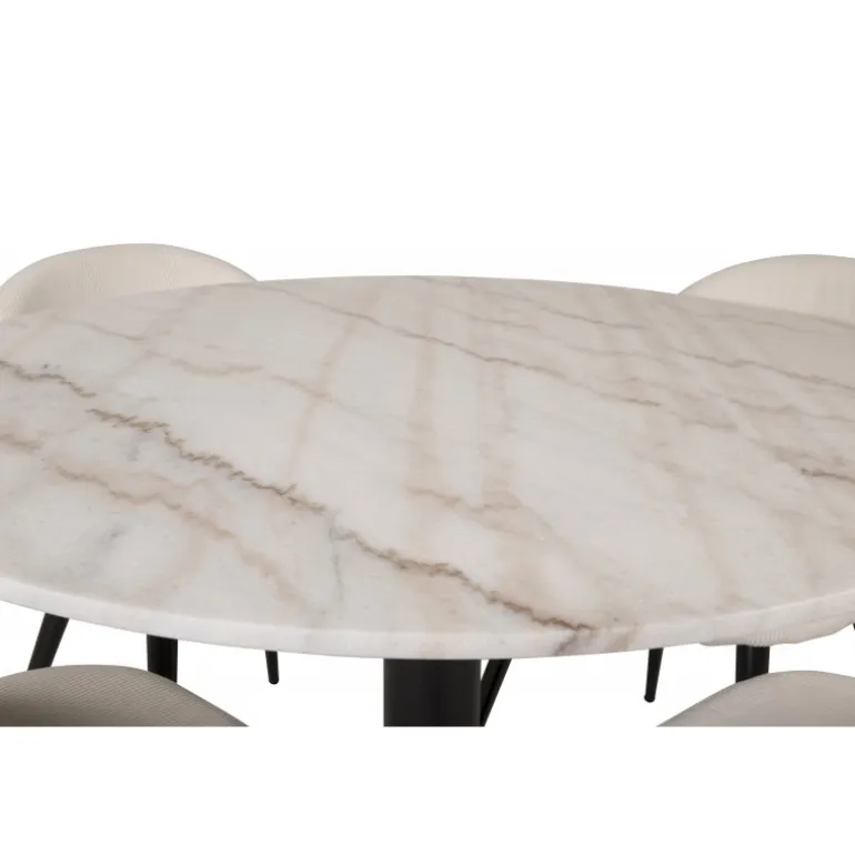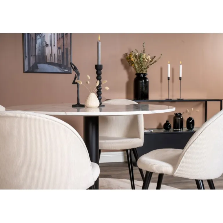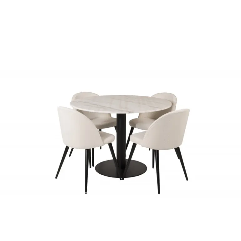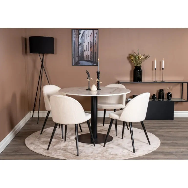 Oplev det moderne og elegante Estelle Rundt Spisebordssæt. Dette sæt kombinerer en stilfuld marmorbordplade med komfortable stole fra Velvet-serien. Perfekt til hyggelige middage og sociale sammenkomster. Bordet og stolene fås i forskellige farver som beige, sort og hvid, hvilket gør det nemt at matche med din indretning. Saml familie og venner omkring dette smukke spisebordssæt og nyd gode måltider i en indbydende atmosfære.
